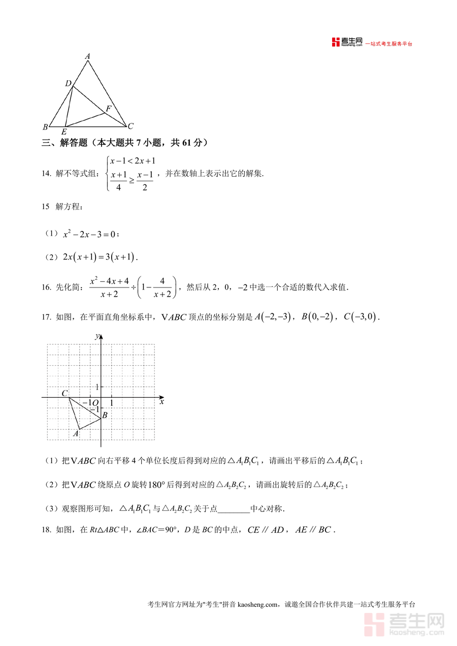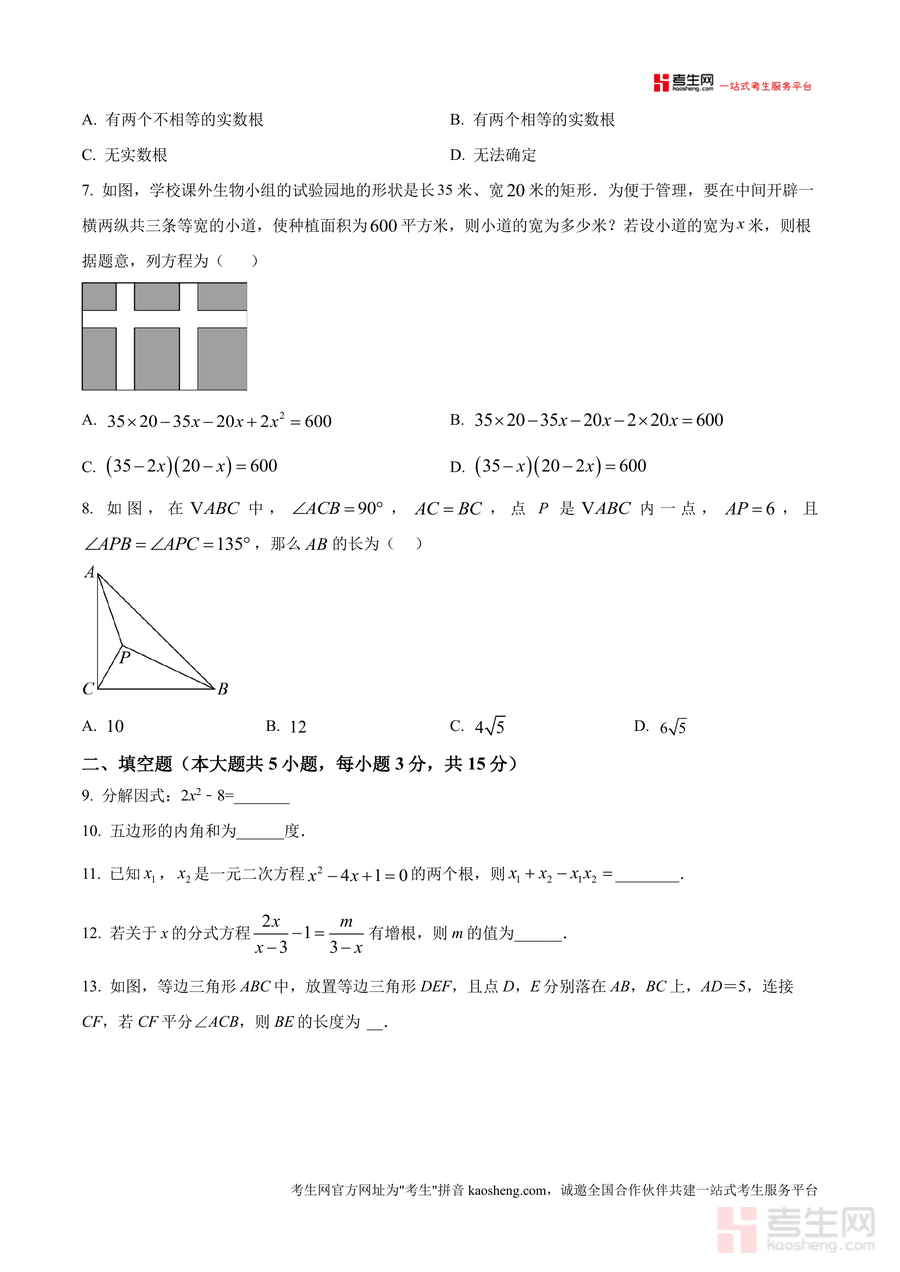 《精品解析:广东省深圳市南山区前海学校2025-2026学年九年级上学期开学数学试题(原卷版).docx》是一份针对深圳南山区前海学校九年级学生开学初学情调研设计的数学原卷资料。该资料严格遵循当地教学大纲与中考命题趋势,包含4页共20道试题,满分100分,考试时长90分钟;题型覆盖选择题(8小题24分)、填空题(5小题15分)及解答题(7小题61分),知识点涉及轴对称与中心对称图形判断、不等式性质、一元二次方程配方与根判别、平行四边形及特殊四边形性质、因式分解、多边形内角和、分式方程增根、几何图形平移旋转、销售利润应用等,全面贴合九年级开学阶段的知识考查需求,能真实反映学生暑假后的知识掌握状态。