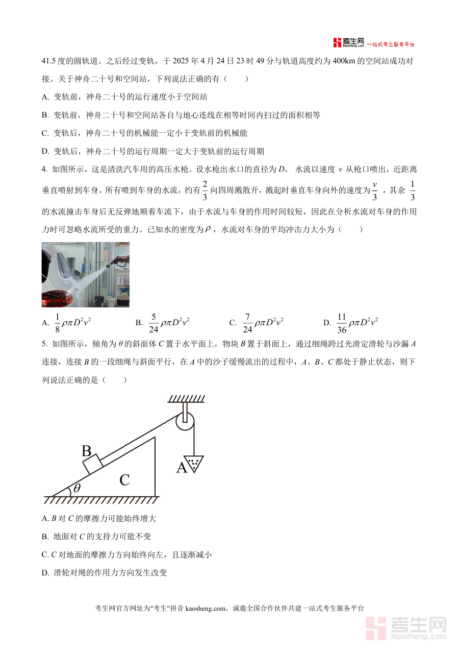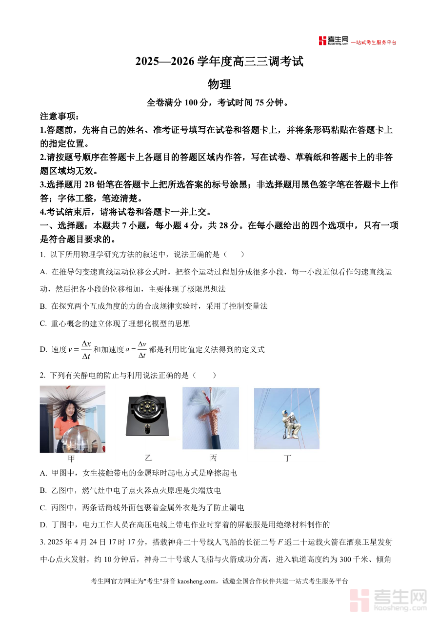 《精品解析:2026届河北省衡水市衡水二中等多校高三上学期三调考试(三模)物理试题(原卷版)》是一份针对高三物理一轮复习后期设计、由衡水二中等河北重点高中联合命题 的高质量真题资料。该试题严格遵循河北高考物理考试大纲要求,全卷满分100分、考试时间75分钟,包含7道单选(28分)、3道多选(18分)及5道非选择题(54分),覆盖匀变速直线运动研究方法、静电场应用、天体运动规律、动量守恒等高考核心考点,并融入神舟二十号发射等热点情境,既保证知识点覆盖全面性,又体现命题时效性与创新性。