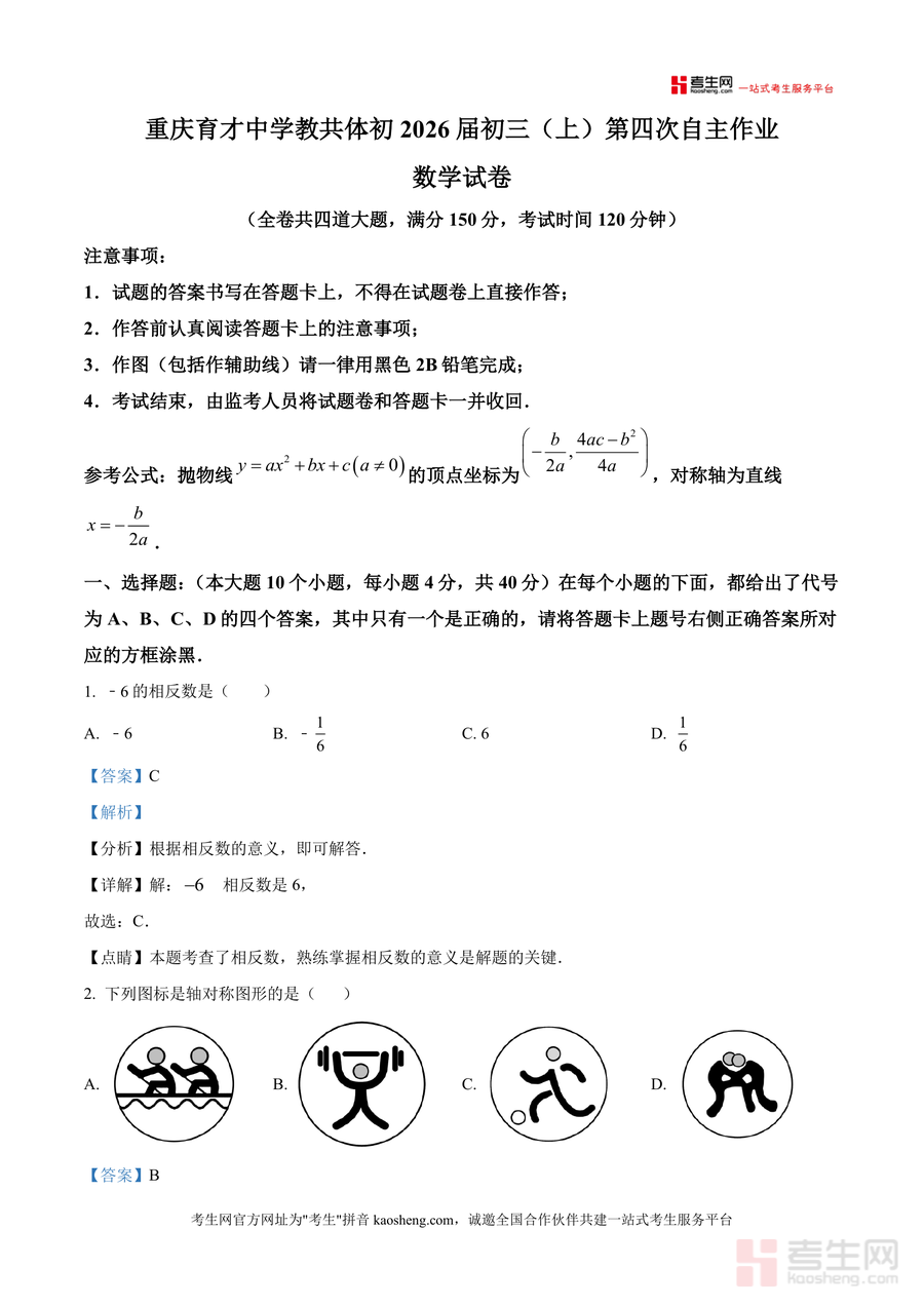 《精品解析:重庆育才中学教共体2025-2026学年九年级上学期第四次自主作业数学试卷(解析版).docx》是一份针对初三学生数学备考阶段的高质量真题解析类备考资料。文件包含全卷四道大题(选择题、填空题、解答题等)完整试题及详尽解析,解析内容覆盖考点定位、解题思路推导、步骤拆解、易错点警示等核心模块,同时融入重庆育才中学教共体教研成果,贴合本地中考命题趋势与教学重点。其特色在于解析过程注重逻辑连贯性与方法迁移性,帮助学生不仅掌握具体题目的解法,更能理解背后蕴含的数据处理与逻辑推理能力培养目标。