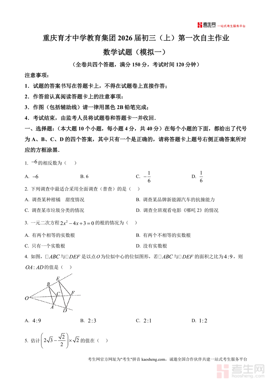 《精品解析:重庆育才中学教育集团2025——2026学年九年级上学期第一次自主作业数学试题(模拟一)(原卷版).docx》是一份针对九年级学生数学阶段性备考设计的权威模拟试题资料。该资料包含选择题(10小题)、填空题(6小题)及解答题(8小题)三大题型,覆盖一元二次方程根的判别式、位似图形性质、统计调查类型选择、几何图形变换(翻折、旋转)等核心知识点,题型结构与重庆中考数学试卷保持一致(满分150分,考试时间120分钟),题目设置兼顾基础巩固与能力提升,能全面检测学生九年级上学期初期数学知识掌握情况。其特色在于依托重庆育才中学教育集团命题资源,具有地域针对性和教学权威性,可有效帮助学生熟悉本地中考命题方向。