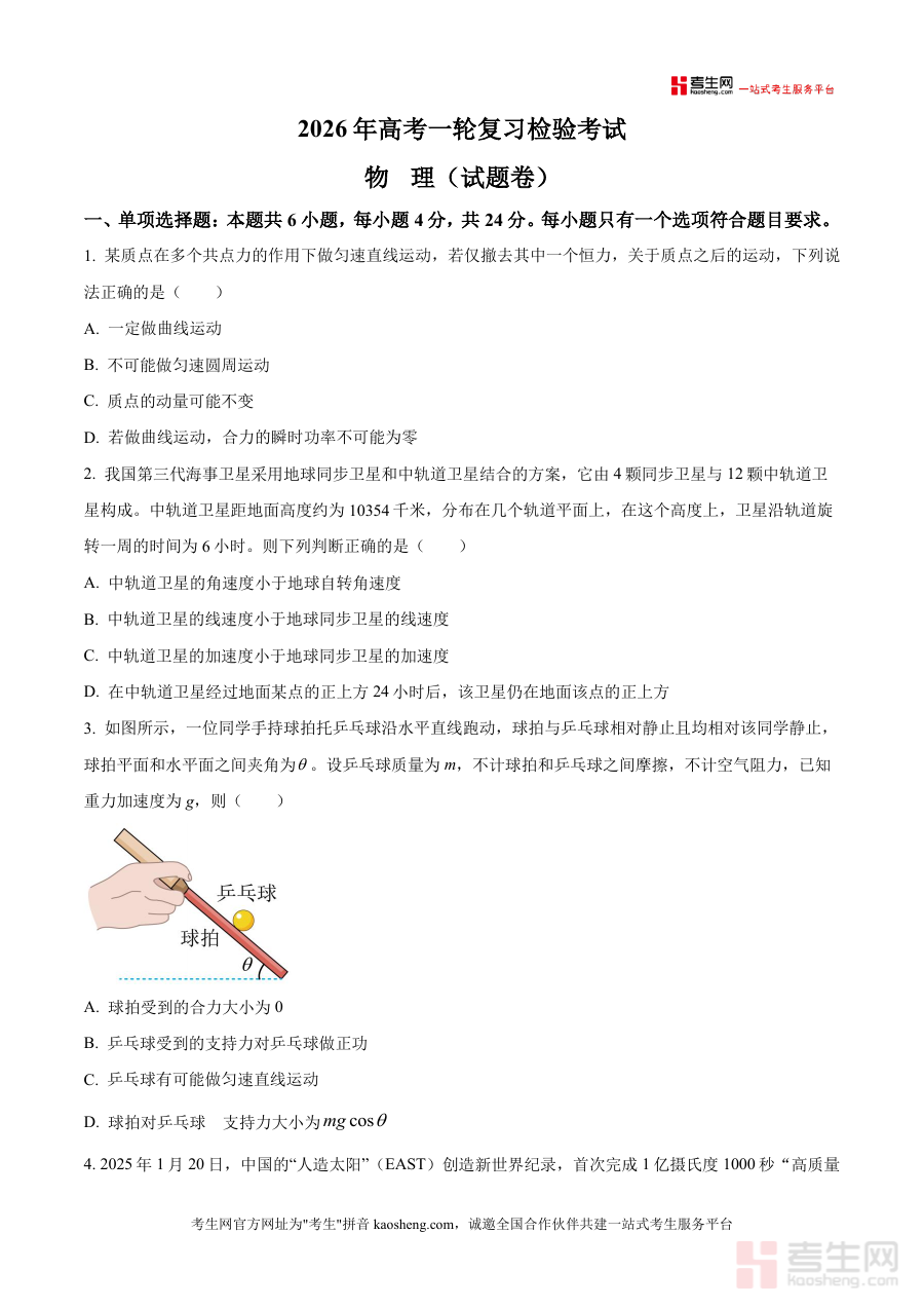 《精品解析:2026届湖南省永州市祁阳市高三上学期一轮复习检验考试物理试题(原卷版)docx》是一份针对高三物理一轮复习阶段性成果检测的专业备考资料。该资料以原卷形式呈现,涵盖单项选择、多项选择及非选择三大题型,涉及力学平衡、天体运动、电磁感应、核反应等高考核心考点,题目设置贴合湖南省高考物理命题趋势,能有效反映学生一轮复习阶段对基础知识的掌握程度与解题能力水平,是衔接一轮复习与后续强化训练的重要载体。