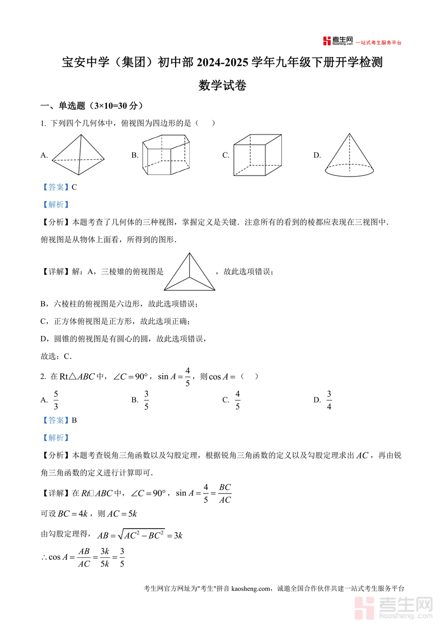 本资料适用于深圳市宝安中学(集团)初中部及周边同类学校九年级学生、初中数学教师及关注孩子数学学习进度家长。其必要性在于开学考是九年级数学学段衔接关键节点,能帮助学生快速适应知识深度升级;不可替代性体现在真题来源权威且解析专业,兼顾基础巩固与能力拓展;长期价值在于积累的解题方法与思维模式可迁移至后续中考备考,为数学学科持续提升提供支撑。