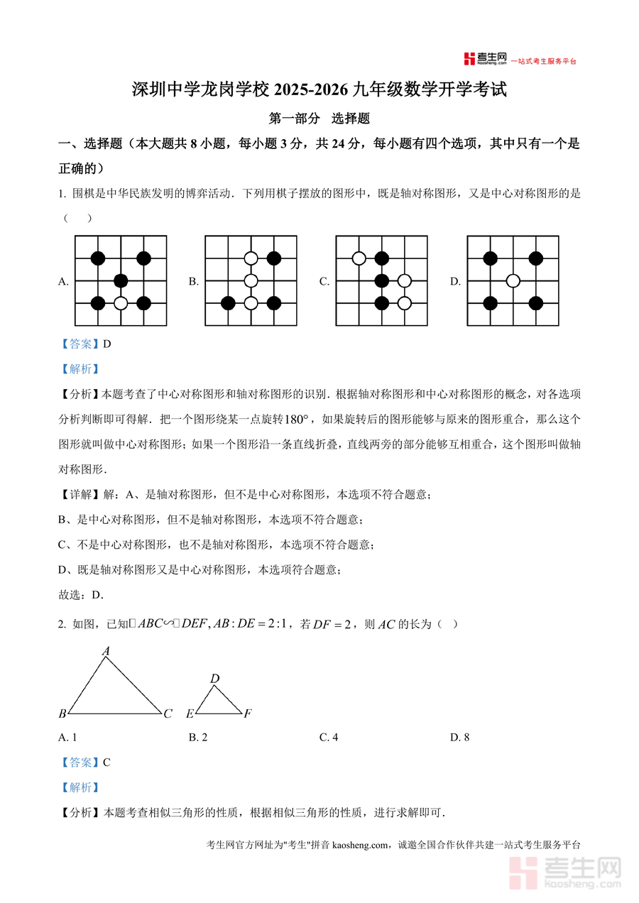 《精品解析:广东省深圳市深圳中学龙岗学校2025-2026学年上学期九年级开学考数学试卷(解析版).docx》是一份针对九年级数学开学考的高质量备考资料,包含选择题、填空题、解答题三大模块共7小题的完整题目及专业解析。资料以该校真实开学考试题为依托,每道题均配备详细的分析、步骤化详解及考点点睛,如选择题中对轴对称与中心对称图形识别的概念梳理、解答题中一元二次方程解法的规范演示,既覆盖九年级上册核心知识点,又突出开学考题型特点与难度梯度,助力学生精准把握考试方向。