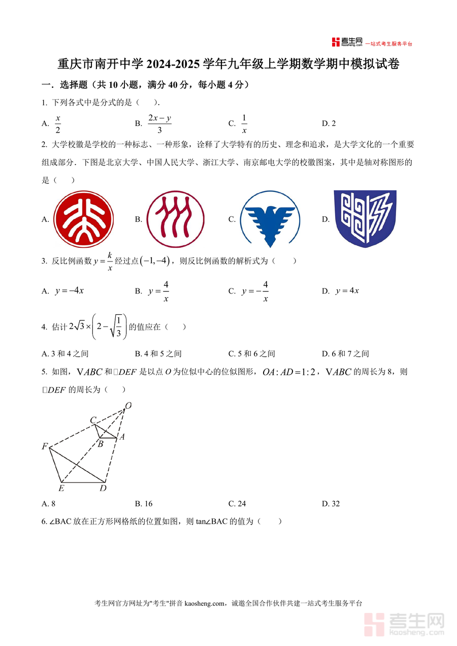 《精品解析:重庆市南开中学2024-2025学年九年级上学期数学期中模拟试卷(原卷版)》是一份针对九年级上学期数学期中备考的权威模拟试卷原卷资料。该试卷严格遵循重庆地区期中命题趋势与课标要求,题型设置涵盖10道选择题(40分)、8道填空题(32分)及8道解答题(78分),总分150分。内容覆盖分式概念、轴对称图形识别、反比例函数解析式推导、无理数估算、位似图形周长计算等基础考点,同时融入二次函数性质分析、矩形折叠几何问题、统计数据分析、实际应用方程求解等综合题型。作为南开中学期中模拟卷,其命题风格贴合名校教学标准,精准反映期中备考重点与难点,提供高质量实战训练素材。