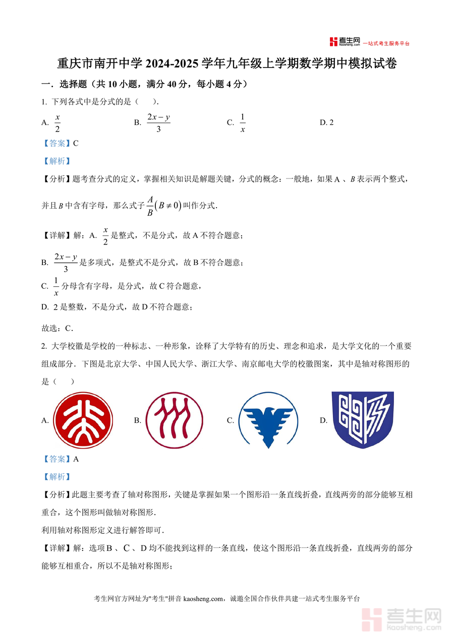 适用人群包括重庆市及周边地区九年级学生尤其是目标重点高中群体初中数学教师可作为教学参考或作业设计素材关注孩子数学成绩提升备考家长辅助制定复习计划;该资料是九年级数学期中备考不可或缺资料之一其不可替代性体现在南开中学命题权威性与解析深度性长期价值在于帮助学生构建系统数学知识体系并为后续中考复习奠定坚实基础。