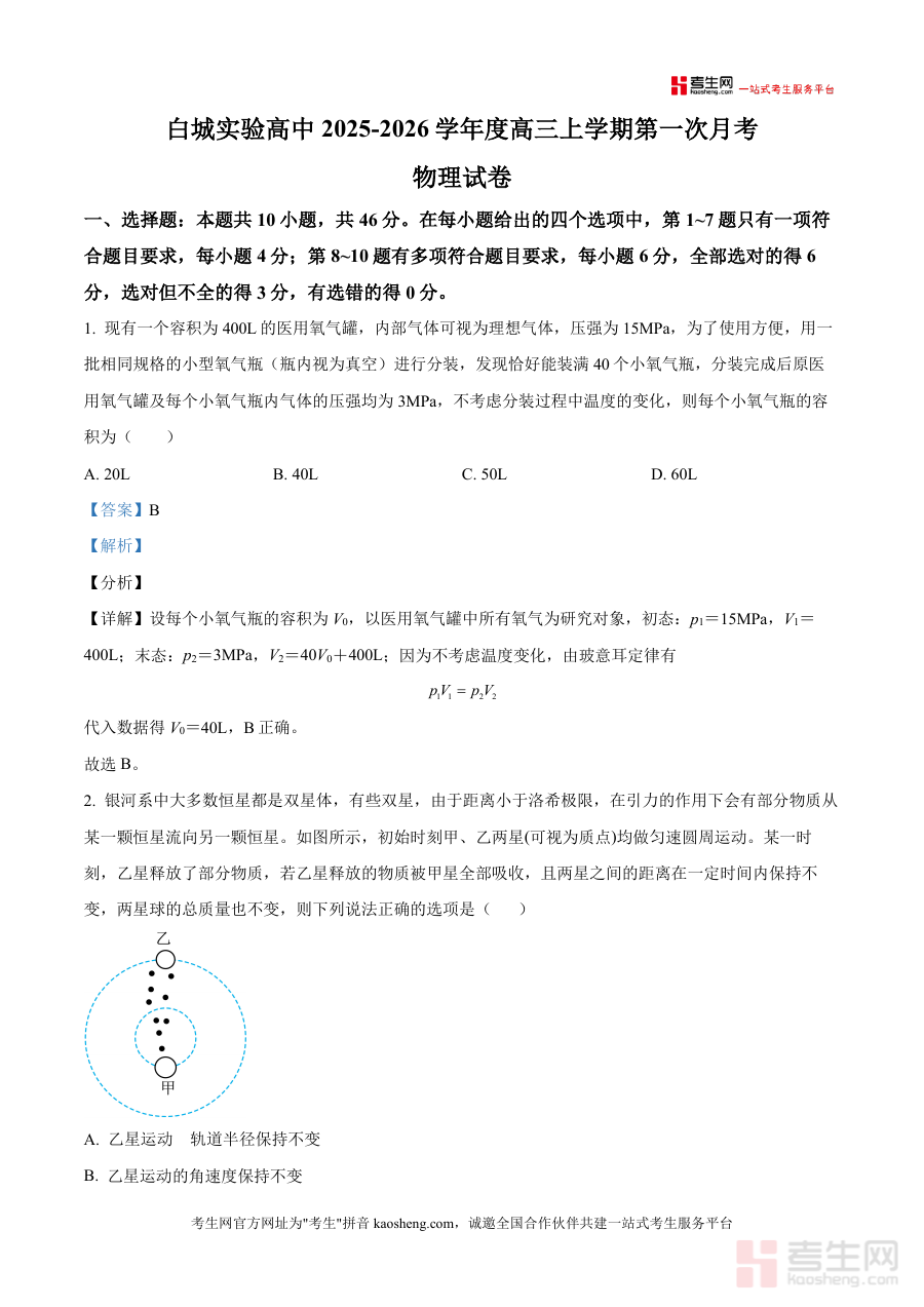 《精品解析:吉林省白城市实验高级中学2025-2026学年高三上学期10月月考物理试题(解析版)》是一份针对高三物理阶段性检测真题设计的专业备考资料,聚焦本校10月月考核心考点与题型体系,涵盖选择题(单选/多选)、非选择题(实验题/计算题)全题型深度解析。资料以真题为载体,拆解理想气体玻意耳定律应用、双星系统运动规律、动能定理与摩擦力综合、电场磁场复合场轨迹分析等高频考点;特色亮点在于每道题配备“考点定位-步骤详解-易错警示”三维解析——如第1题标注“研究对象选取易错点”、第6题绘制复合场运动轨迹辅助理解,帮助学生精准把握解题逻辑与避坑技巧。
