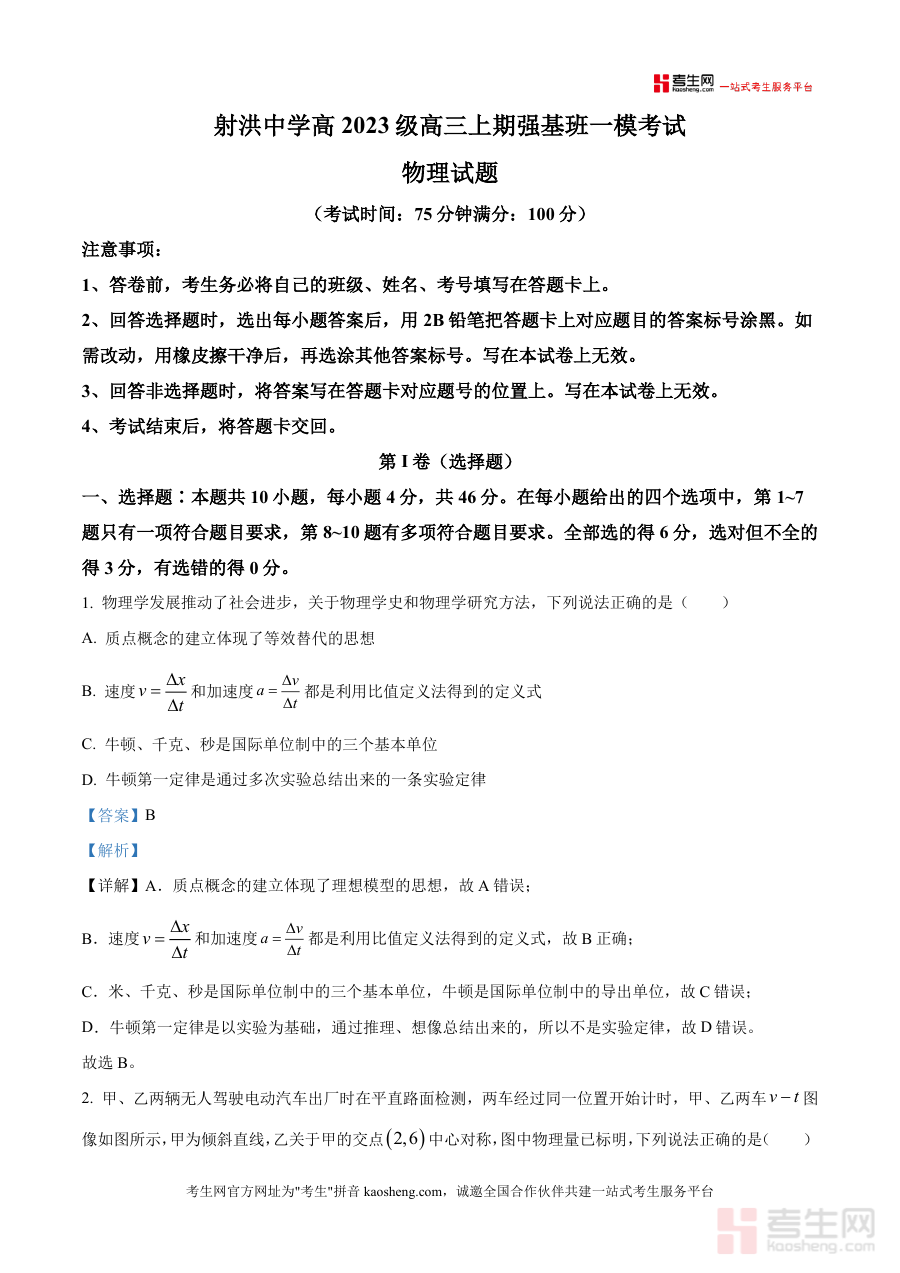 《精品解析:四川省射洪中学2025-2026学年高三(强基班)上学期一模物理试题(解析版)》是一份针对高三强基班学生物理备考需求打造的专业资料,包含完整的一模物理试题及逐题详细解析。试题覆盖质点模型构建、平抛运动规律、圆周运动向心力分析、万有引力定律应用等核心知识点;解析部分不仅给出正确答案推导,还融入比值定义法、理想模型法等物理研究方法,结合高考命题趋势对易错点进行深度剖析,并补充相关拓展知识以拓宽学生思维边界。