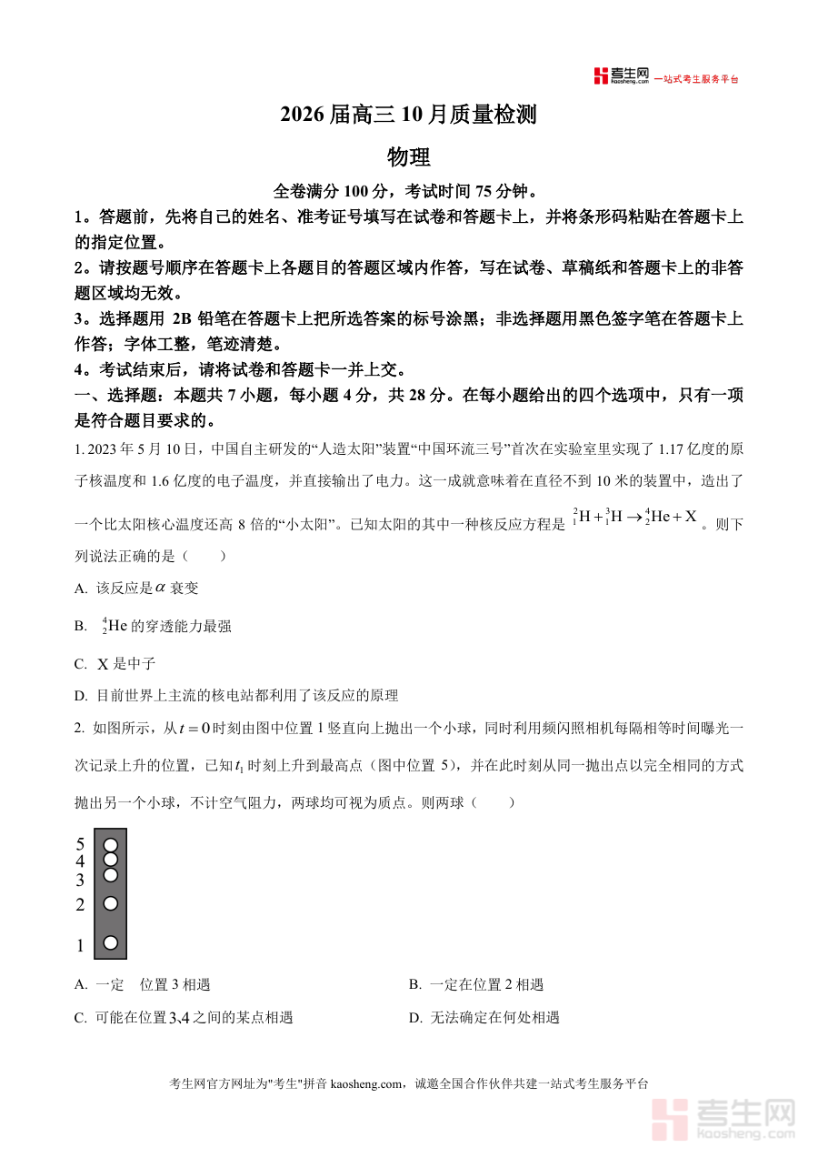 《精品解析:山西省临汾市临汾第一中学2025-2026学年高三上学期期中考试物理试题(原卷版).docx》是一份针对高三物理期中备考设计、贴合临汾一中教学进度与考纲要求的标准化期中试题资料。其主要内容覆盖原子核反应原理、抛体运动规律、蹦极受力分析等高频考点,包含7道单项选择题(28分)、3道多项选择题(18分)及5道非选择题(54分),全卷满分100分,考试时长75分钟,严格遵循高考物理题型结构与难度梯度;特色亮点在于融入本土场景如山西窑洞建筑力学模型题及前沿科技如“中国环流三号”人造太阳核反应题,增强试题情境化与实用性,帮助学生将理论知识与实际应用深度结合。