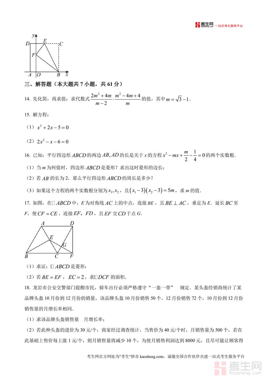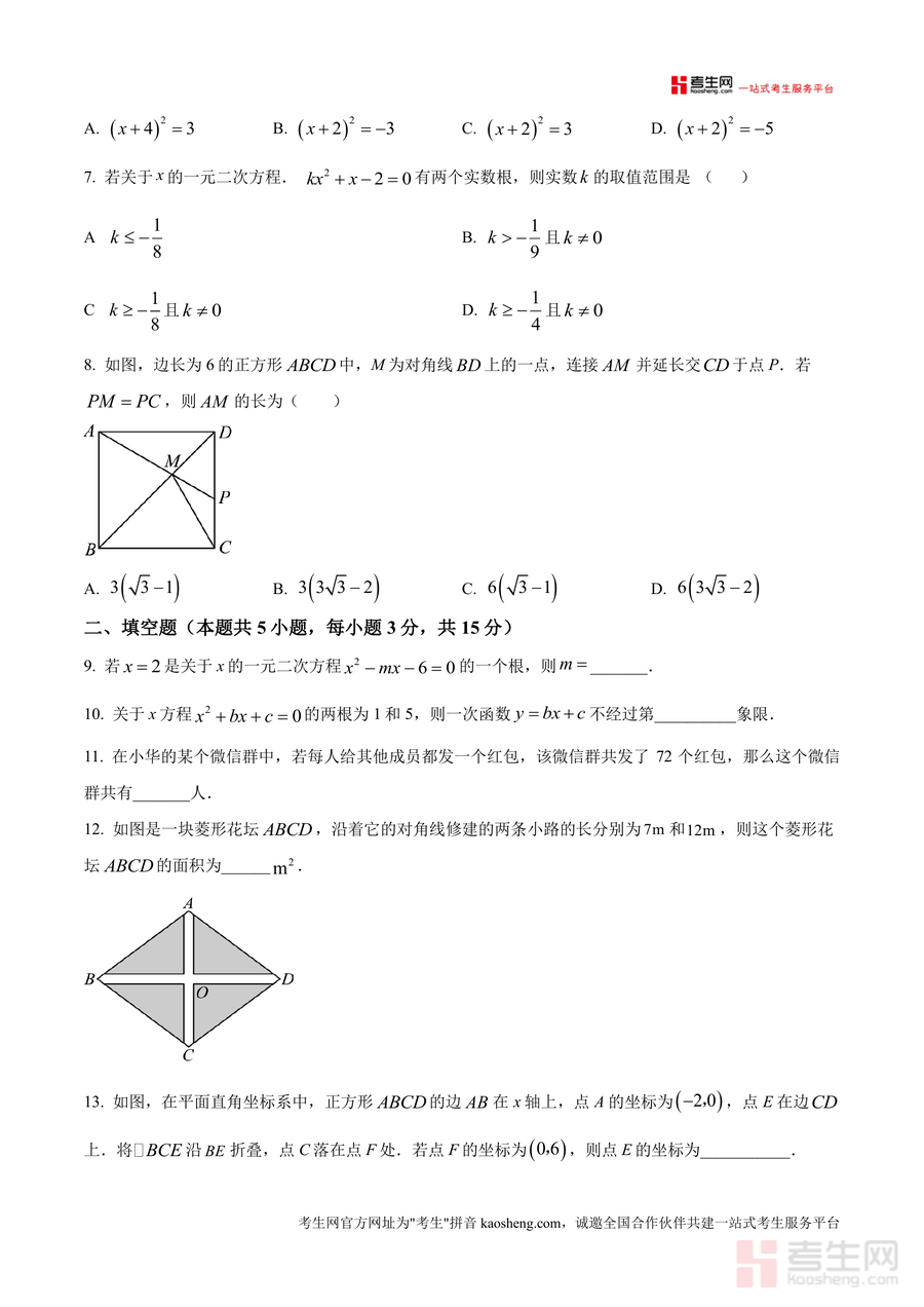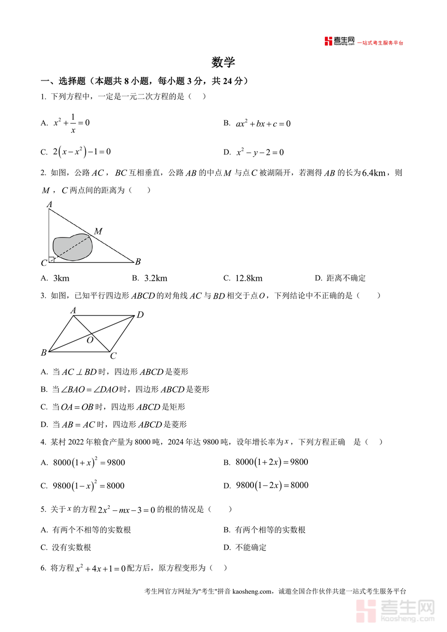 《精品解析:广东省深圳市罗湖区翠园东晓中学2025-2026学年上学期九年级开学考数学试卷(原卷版)》是一份针对该校九年级学生开学考设计的精准备考资料,主要内容涵盖选择题(8小题)、填空题(5小题)、解答题(7小题)三大题型模块,覆盖一元二次方程解法与根的判别式、平行四边形及特殊四边形性质应用、几何折叠与坐标系结合、增长率应用题等九年级数学核心考点;特色亮点在于依托该校真实考试原题编制原卷版,题型设置贴合本地教学进度与命题趋势,能直观反映学校对学生暑期知识巩固效果的检测方向。