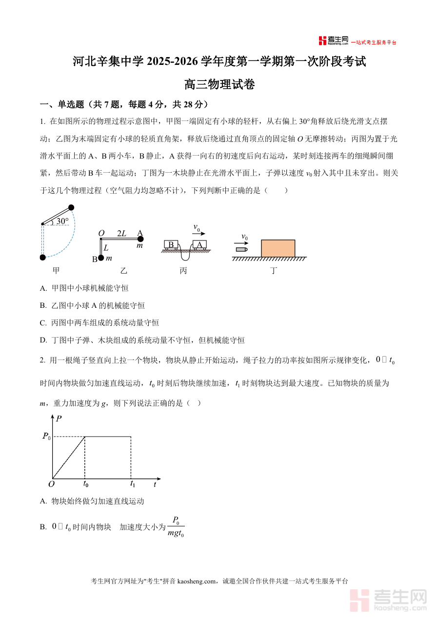 《精品解析:河北省石家庄市辛集中学2025-2026学年高三上学期第一次阶段测试物理试题(原卷版)》是一份针对高三物理学科阶段性学习成果检测设计的备考资料。该试题涵盖单选题(7题)、多选题(3题)、实验题(2题含验证力平行四边形定则及机械能守恒定律实验操作)、解答题(3题涉及动量守恒、传送带模型等综合应用)四大题型模块;聚焦动量守恒定律、机械能守恒定律、功能关系、弹性碰撞等高三上学期核心物理知识点,完整呈现辛集中学本次阶段测试的试题原貌与题型结构;其特色在于严格遵循该校教学进度与考试要求设计试题梯度及考点分布,并贴合高考命题趋势对高频考点进行针对性考查。