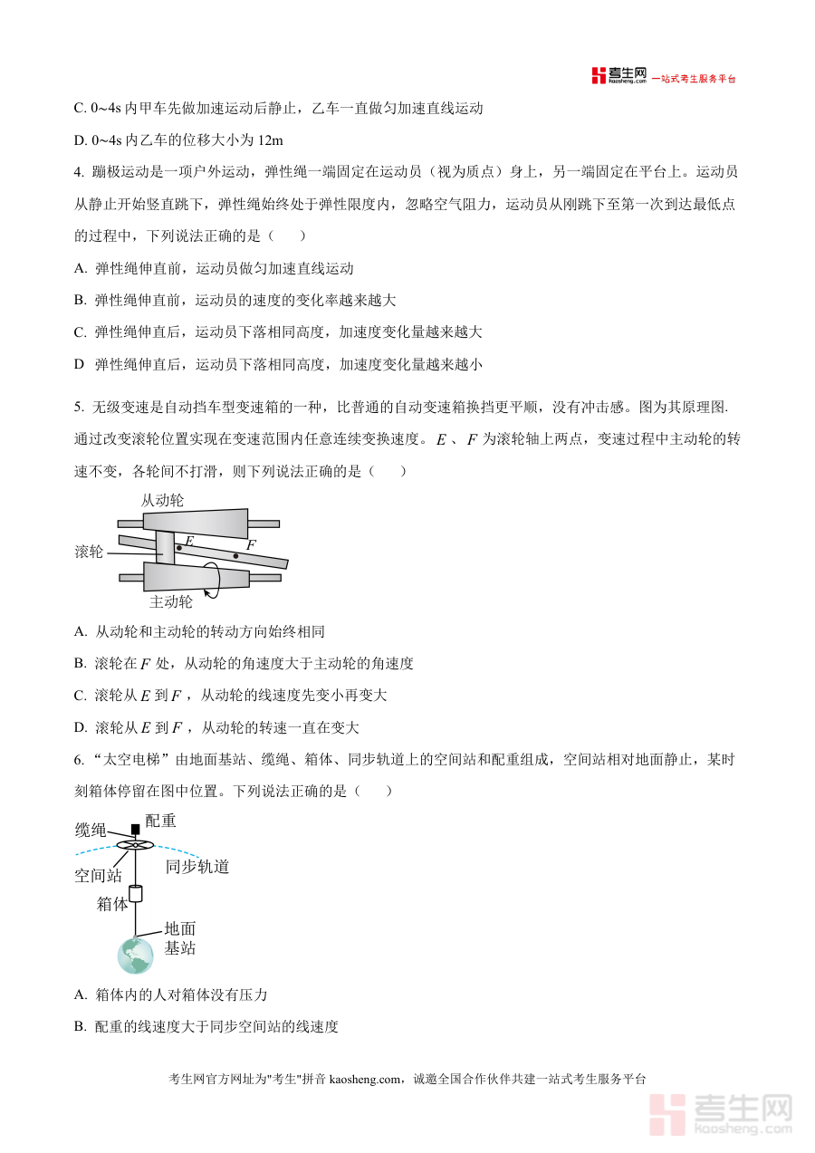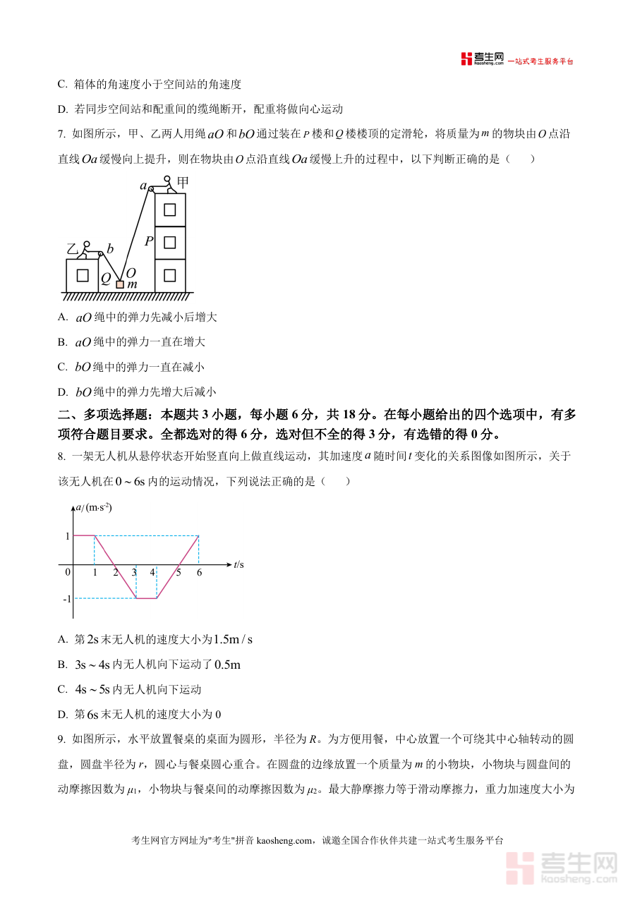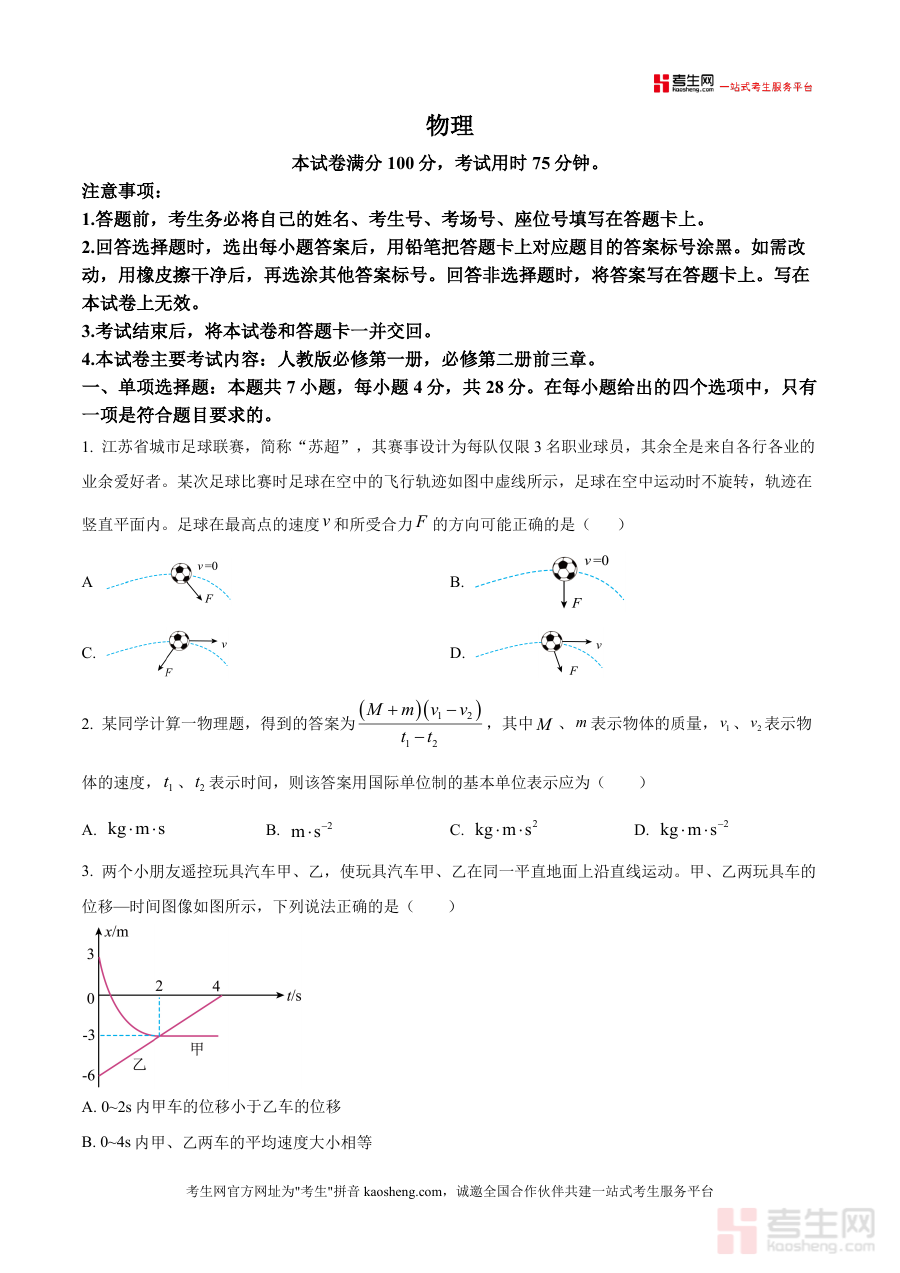 《精品解析:河南省周口市鹿邑县五校联考2025-2026学年高三上学期10月月考物理试题(原卷版).docx》是一份针对高三物理阶段性复习设计的高质量备考资料,核心定位为本地五校联考实战检测工具。主要内容覆盖人教版必修第一册全册及必修第二册前三章核心知识点,题型设置包含7道单项选择题(共28分)、3道多项选择题(共18分)及5道非选择题(含实验题如弹射器弹丸速度测量、牛顿第二定律探究,计算题如传送带输送煤块分析等,共54分)。特色亮点在于题目设计紧密结合生活实际场景(如足球运动轨迹分析、蹦极过程力学变化、无级变速原理应用)及学科前沿情境(如风洞实验小球运动),既考查基础概念与公式应用,又注重学生物理建模能力与问题解决能力,贴合联考命题的实用性与创新性导向。