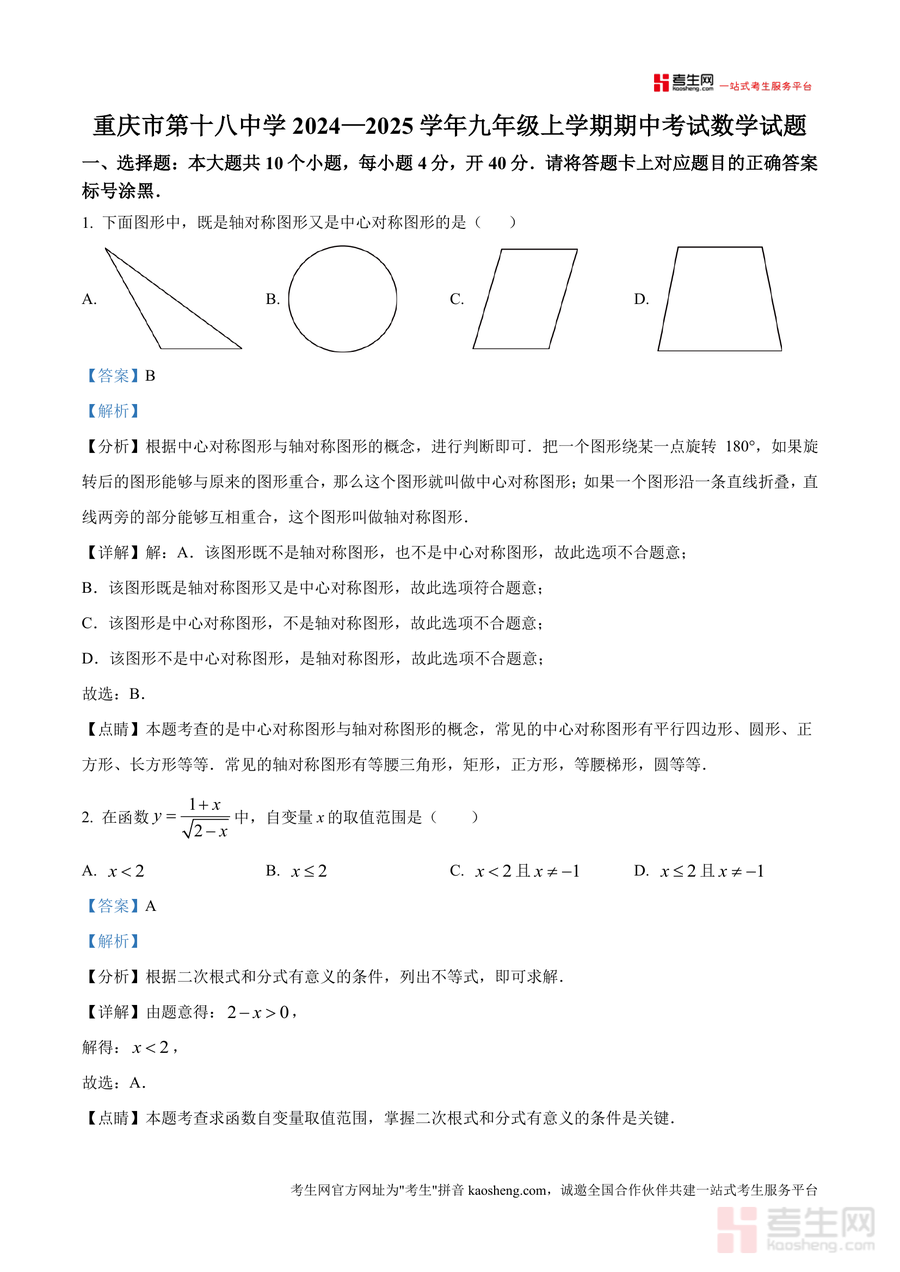 《精品解析:重庆市第十八中学2024—2025学年九年级上学期期中考试数学试题(解析版).docx》是一份针对该校九年级上学期期中数学考试设计精准备考资料。文件涵盖完整试题及逐题深度解析,包含选择题、填空题等核心题型,每道题配备详细分析、解答步骤及点睛部分,覆盖轴对称与中心对称判定、函数自变量取值范围确定、二次函数顶点坐标求解等九年级数学核心考点。其特色在于贴合该校命题风格,通过真题解析帮助学生把握考试方向,解析过程注重方法提炼与思路引导,避免机械记忆,助力学生理解考点本质。