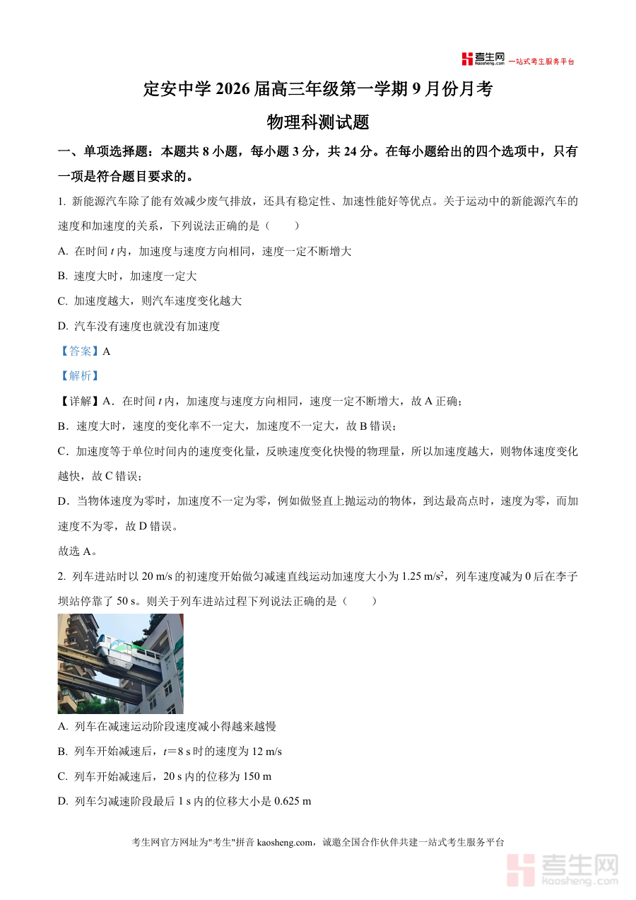 《精品解析:海南省省直辖县级行政单位定安县联考2025-2026学年高三上学期9月月考物理试题(解析版)》是一份聚焦定安县高三物理联考真题 的专业备考资料。该资料覆盖单项选择、多项选择及实验题等核心题型板块,每个题目均配备深度解析,包含考点定位、逻辑推导及易错点警示,如对新能源汽车运动学关系、匀变速直线运动计算、受力平衡分析等高频考点进行细致拆解。其特色在于结合本地联考命题趋势构建解析体系,帮助学生快速掌握题型规律与解题策略,同时融入实验题操作要点与数据处理方法,强化理论与实践的结合。