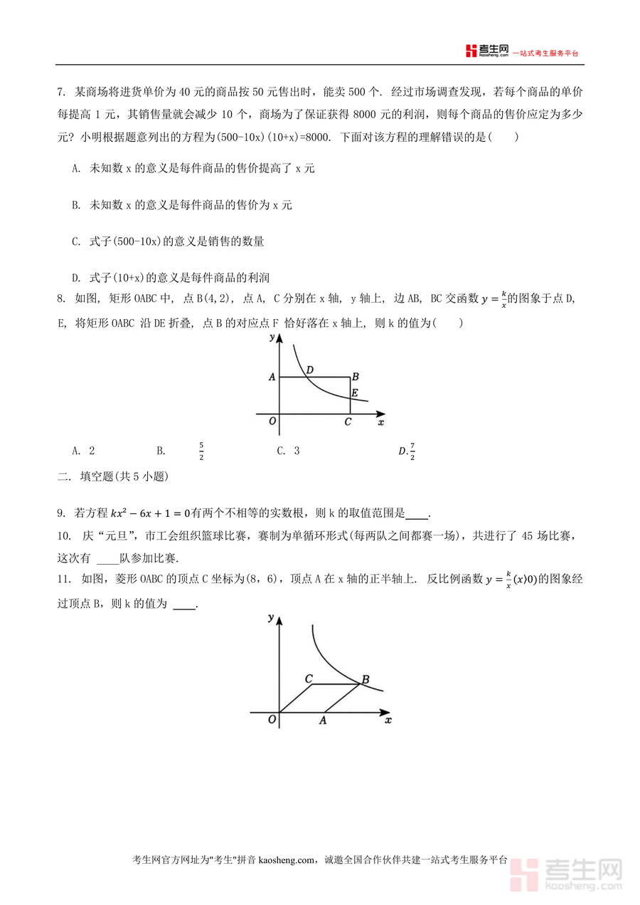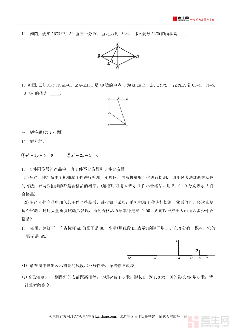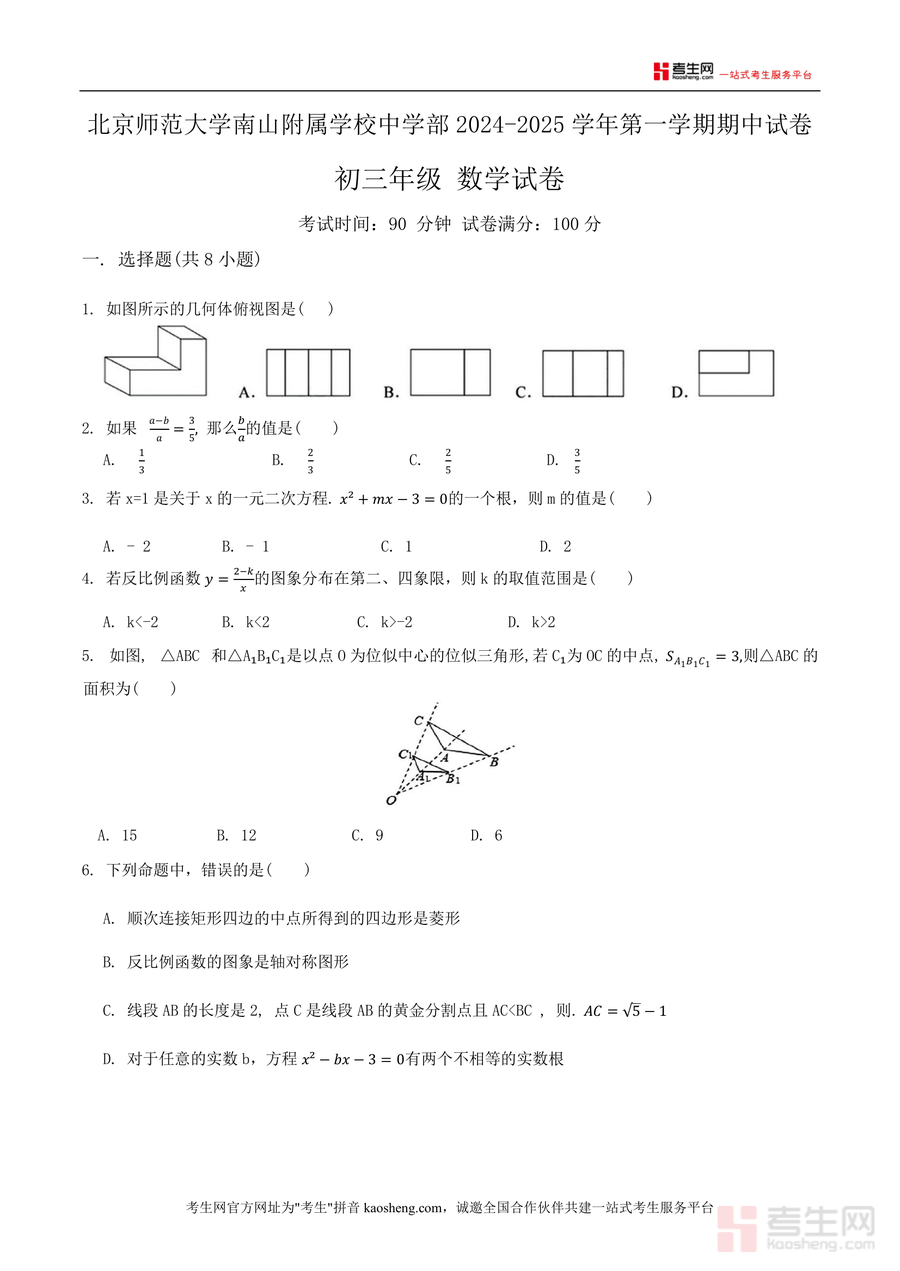 《广东省深圳市北京师范大学南山附属学校中学部2024-2025学年上学期九年级期中考试数学试卷.docx》是一份北师大南山附属学校中学部针对九年级学生设计的期中数学真题资料,包含选择题(8小题)、填空题(5小题)、解答题(7小题)三大题型。内容覆盖九年级上册核心知识点:一元二次方程根的判别与应用、反比例函数图象性质、几何图形(菱形、矩形、位似三角形)的性质与证明、概率统计计算及综合应用题等。其特色在于题型设置贴合深圳本地期中考核要求,既有基础概念题(如几何体俯视图判断、命题正误辨析)又有综合应用题(如折叠问题与函数结合、销售利润方程应用),能全面检测学生知识掌握程度与解题能力。