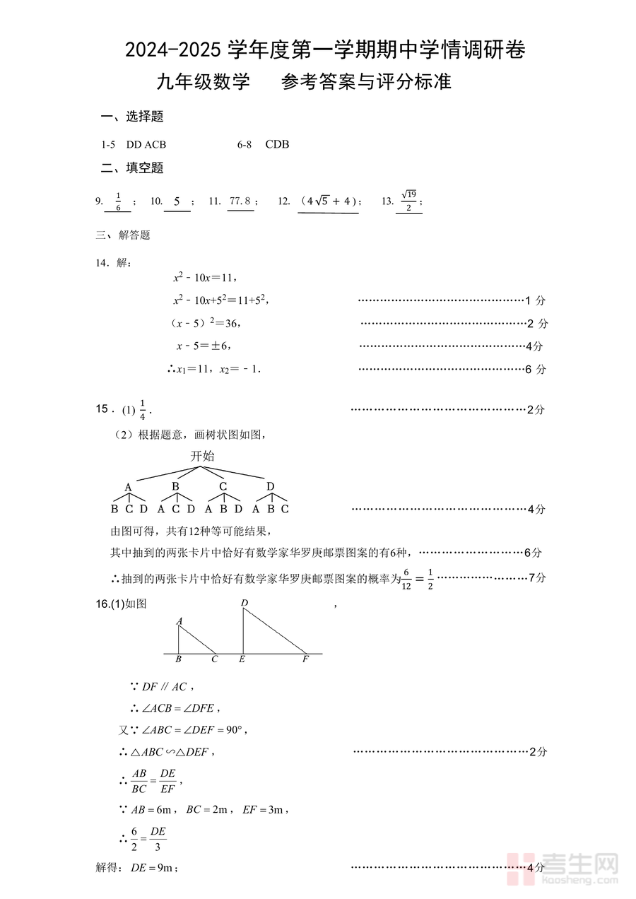 《2024-2025学年度第一学期九年级期中学情调研数学学科卷参考答案和评分标准.pdf》是一份针对九年级上学期期中数学调研卷的权威参考资料,核心定位为辅助师生进行考试后分析与能力提升。其主要内容涵盖选择题、填空题及解答题的完整答案,且对解答题提供了详细的分步解析与评分要点,如第14题一元二次方程求解中每一步的得分说明、第15题概率计算的树状图绘制要求等。特色亮点在于严格遵循当前数学课程标准要求,结合学情调研的命题方向,确保答案准确性与评分标准规范性,为师生提供清晰参考依据。