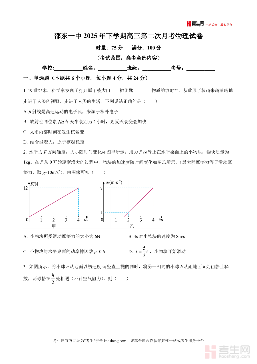 《精品解析:湖南省邵东市第一中学2025-2026学年高三上学期第二次月考物理试题(原卷版)》是一份聚焦高三物理阶段性备考需求、对标高考标准的高质量检测资料,覆盖高考全部内容范围,包含单选题(6题)、多选题(4题)、实验题(2题)及计算题(3题)四大题型,涉及原子核物理、力学运动分析、电磁感应等核心考点。其特色在于贴合邵东一中教学进度与高考命题趋势,题型设置与分值分布严格遵循高考要求,能精准反映学生对重点知识模块的掌握程度,为后续备考提供清晰方向指引。