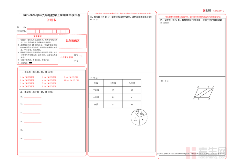 《九年级数学期中模拟卷(答题卡)A3版(重庆专用,人教版).docx》是一份针对重庆地区使用人教版教材的九年级学生设计的期中备考专用答题卡资料,紧密结合2025-2026学年上学期期中模拟卷的题型结构与答题要求,核心内容包含与模拟卷匹配的标准化答题区域、规范的题号排列及分值标注,特色亮点在于采用A3版面布局,完全贴合本地期中考试答题卡格式,预留充足书写空间的同时兼顾排版合理性,便于学生模拟真实考试场景下的答题操作。