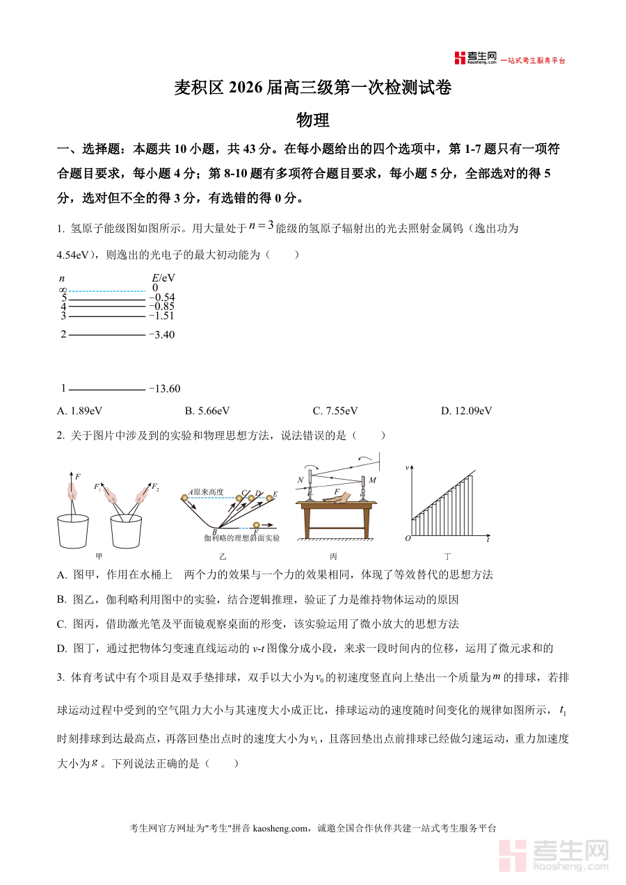 《精品解析:甘肃省天水市麦积区2025-2026学年高三上学期第一次检测物理试卷(原卷版)》是一份针对甘肃省天水市麦积区2026届高三学生设计的阶段性检测物理原卷资料,聚焦高考物理核心考点与本地命题趋势。试卷结构严格遵循高考物理题型规范,包含选择题与非选择题两大模块:选择题共10小题(1-7题为单选每小题4分;8-10题为多选每小题5分)覆盖氢原子能级跃迁、物理思想方法应用、运动学规律、电磁感应等高频考点;非选择题共5小题(含实验题与计算题)涉及“探究加速度与合外力关系”“测定材料电阻率”等经典实验操作,以及光学折射、动力学综合分析、电磁感应焦耳热计算等综合题型。作为本地官方检测原卷其内容与麦积区高三教学进度高度匹配,能真实反映学生一轮复习初期知识掌握情况。