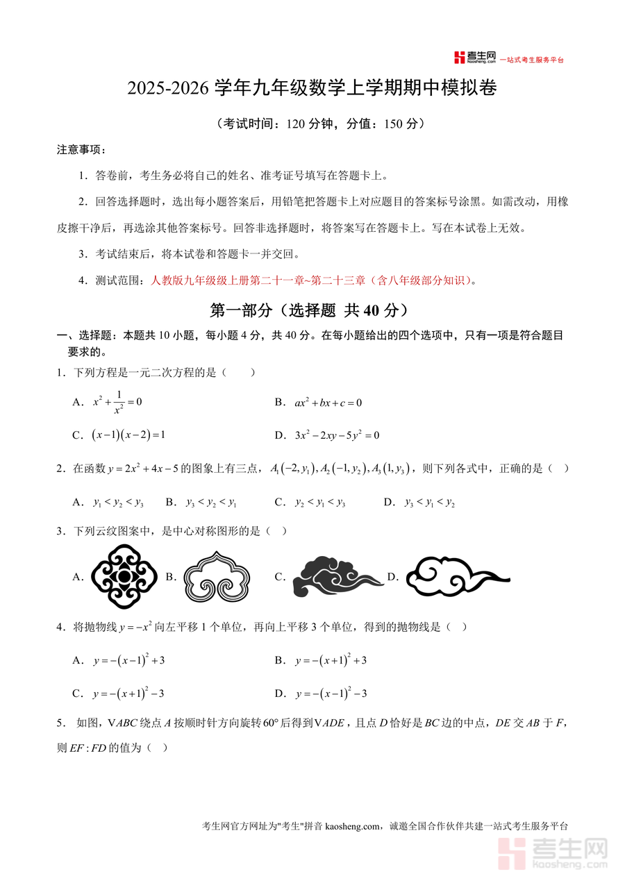 本模拟卷核心用途在于帮助学生进行期中前知识自测与查缺补漏、教师开展课堂模考或针对性训练、家长辅助孩子进行阶段性复习。使用场景包括学生自主限时训练以适应考试节奏、教师课堂检测学生知识掌握情况、家庭辅导中作为强化练习素材;用户价值体现在通过真实考试场景模拟提升应试能力,并精准定位知识薄弱环节;备考优势在于考点覆盖全面且突出重点(如一元二次方程解法、二次函数图像性质、旋转几何变换等),能助力学生构建知识体系并强化解题技巧。