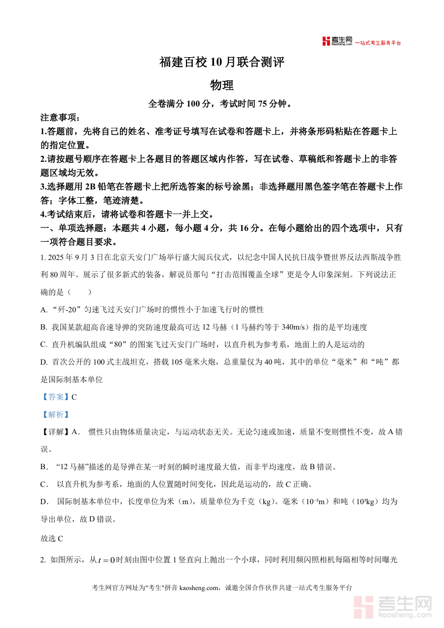 《精品解析:福建省百校2025-2026学年高三上学期10月联合测评物理试题(解析版).docx》是一份针对福建百校高三物理阶段性测评设计专业备考资料,包含全卷16道试题及逐题详细解析(涵盖单项选择、双项选择、非选择三大题型)。其核心特色在于解析紧扣物理学科逻辑,如对"歼-20惯性""超高音速导弹速度类型"等题目,不仅给出正确选项还深度剖析错误选项根源;同时融入阅兵装备、蹦极运动等实际情境案例,将抽象知识点与现实应用结合,帮助使用者理解物理原理实际意义,为备考资料注入实用性与针对性。