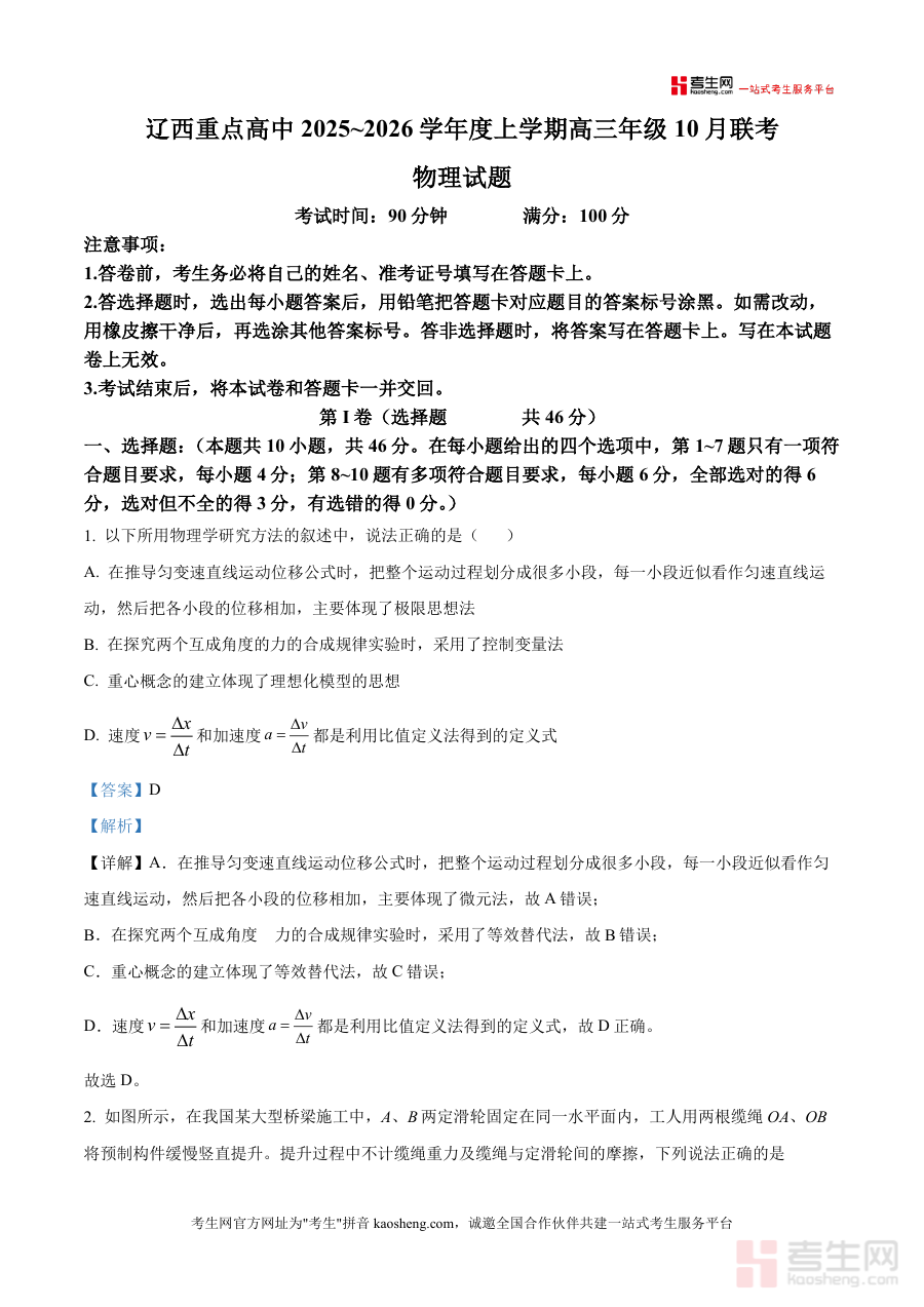 《精品解析:辽宁省辽西重点高中2025-2026学年高三上学期10月联考物理试题(解析版).docx》是一份针对高三物理备考需求打造专业真题解析资料,聚焦辽西重点高中联考命题趋势,涵盖选择题(含单选与多选)及非选择题全题型详细解读。资料不仅提供精准答案,更深度融合物理思想方法——如匀变速直线运动位移推导的微元法、互成角度力合成的等效替代法等,同时对考点分布(运动学、力学平衡、圆周运动、天体物理等)进行系统梳理,帮助使用者把握核心知识脉络,是兼具实用性与指导性的备考工具,为高三物理复习提供清晰路径。