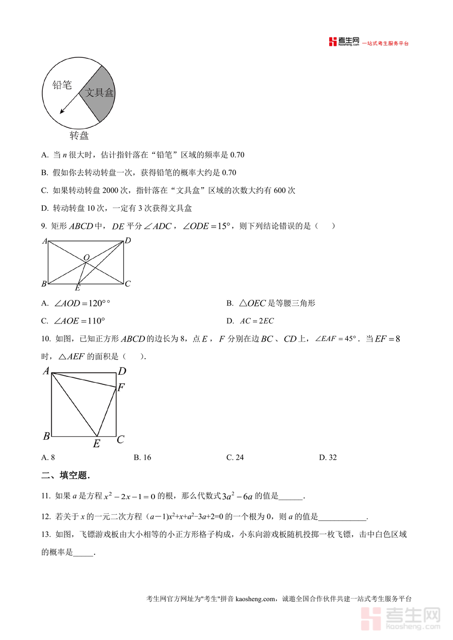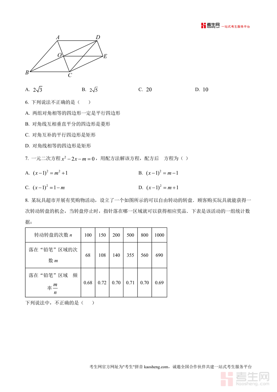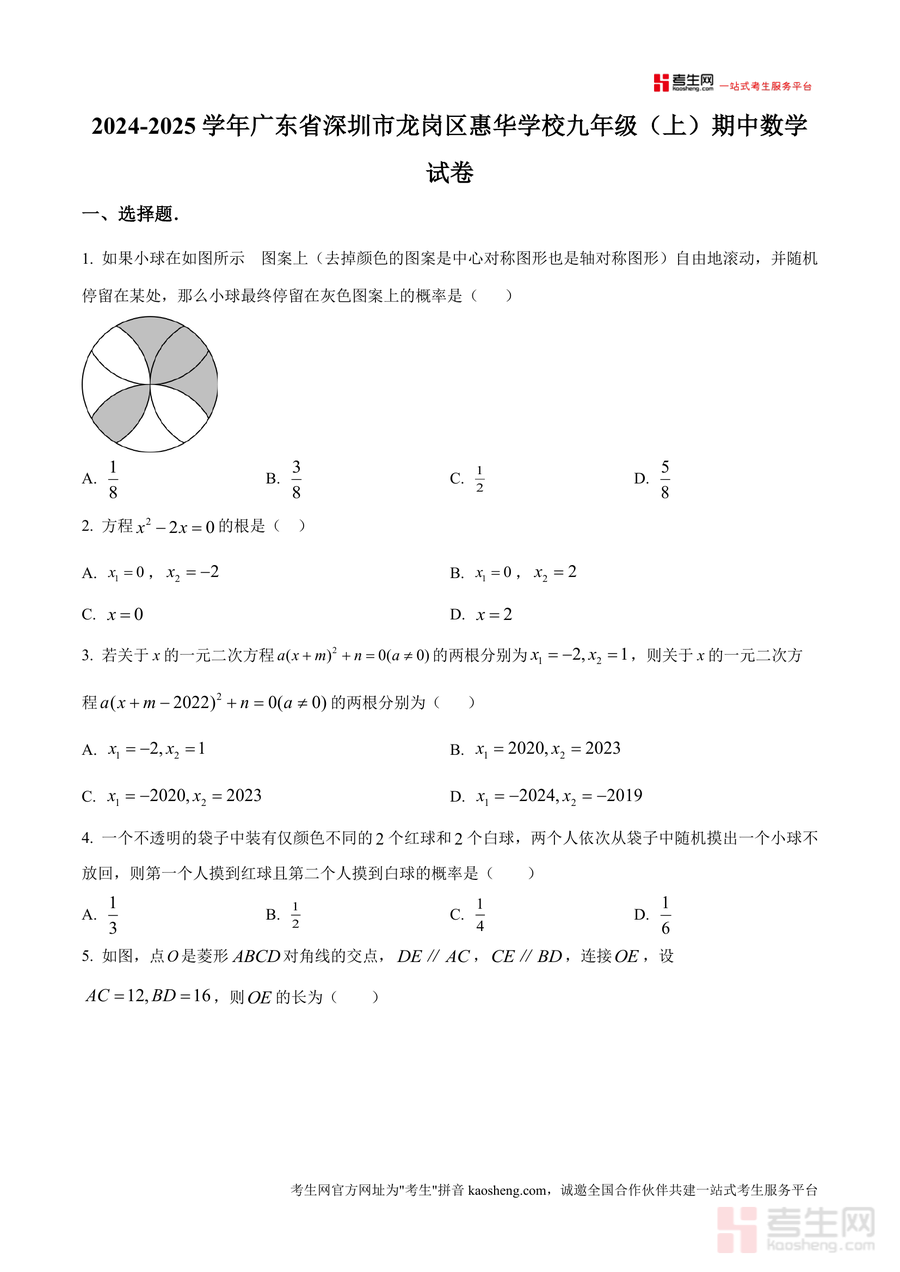 《精品解析:广东省深圳市龙岗区惠华学校2024-2025学年九年级上学期期中数学试卷(原卷版).docx》是一份聚焦深圳龙岗区惠华学校九年级学生期中数学备考需求的优质资料。文件包含选择题(涉及中心对称图形与轴对称图形结合概率计算、一元二次方程根求解、几何图形性质判断等)、填空题(代数式求值、方程参数确定、概率频率估算等)及解答题(方程解法、实际应用题建模、几何证明题、概率统计分析等)三大题型,全面覆盖九年级上学期核心知识点如函数与方程应用、图形变换规律、概率统计方法等。其特色亮点在于严格遵循该校期中命题趋势与学情特点设计题型,原卷版呈现完整保留考试真实题型结构与难度梯度,为学生提供高度贴合实际考试场景的练习载体。