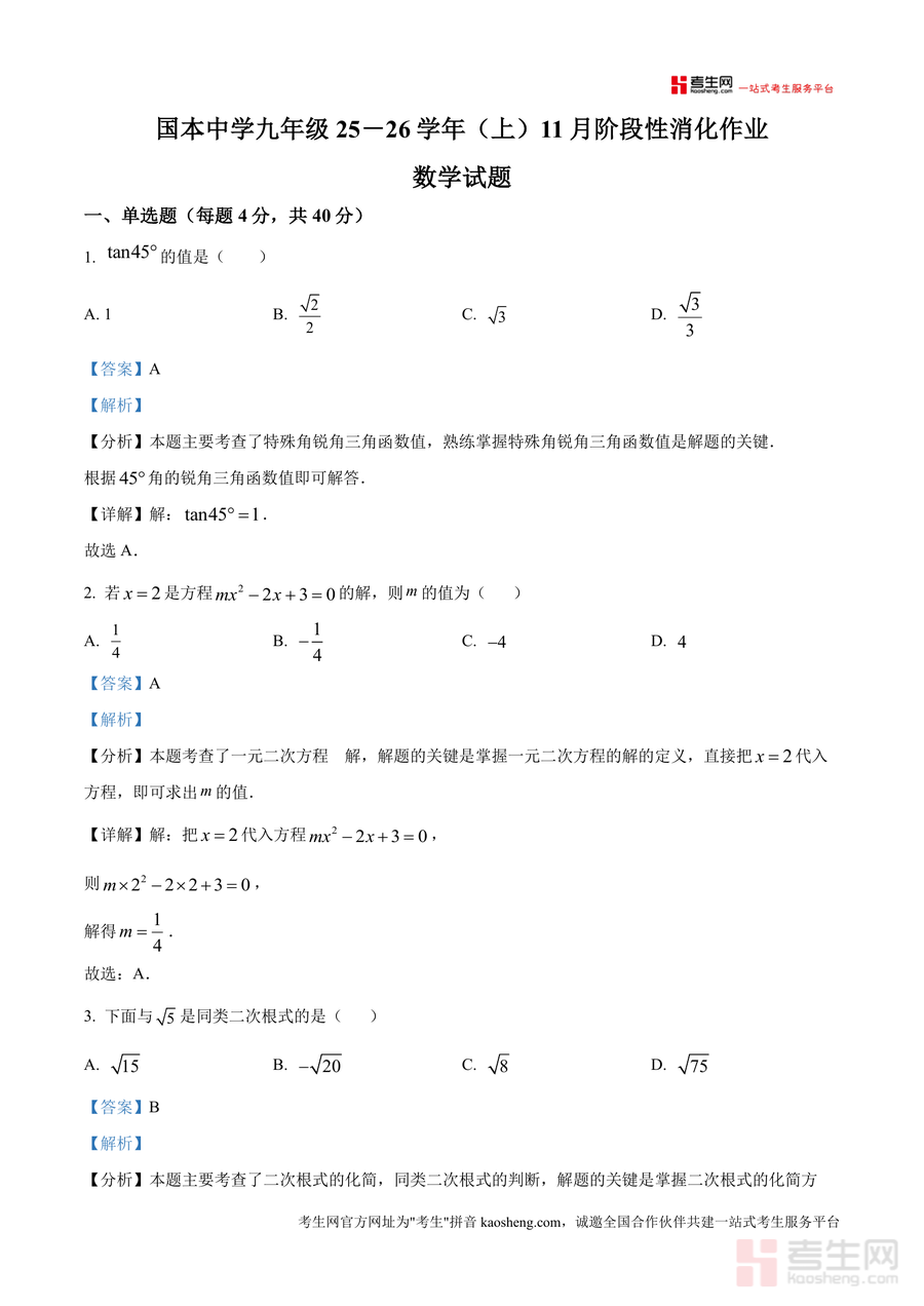 本资料适用于重庆市万州国本中学九年级在读学生、初中数学教师及备考同类期中数学考试 的其他九年级学生。作为贴合该校教学实际的真题解析资料,它具有不可替代性——精准匹配该校阶段性教学内容,能帮助学生高效巩固所学知识;其长期价值体现在培养学生逻辑思维与解题能力,为后续中考数学复习奠定坚实基础,是九年级数学学习过程中不可或缺的优质备考资源。