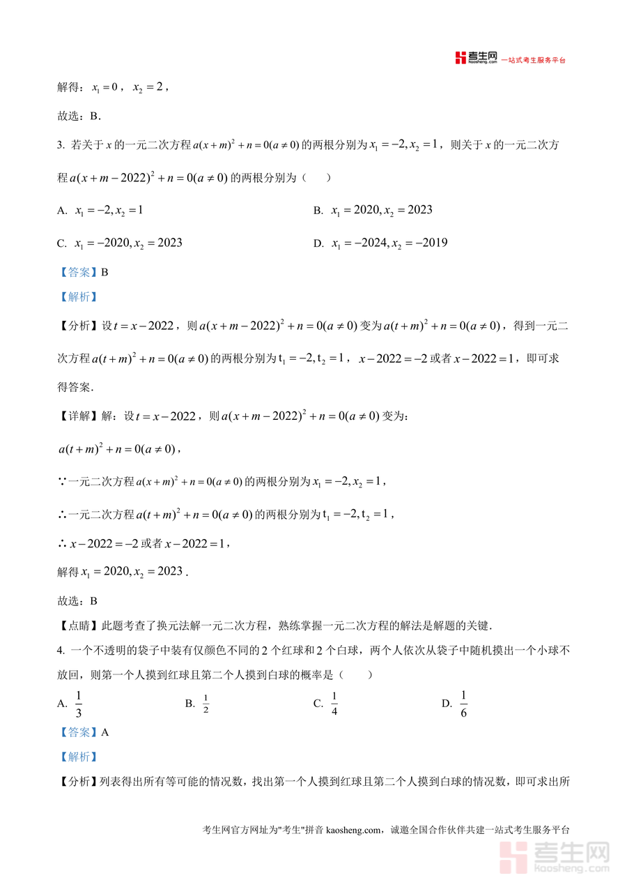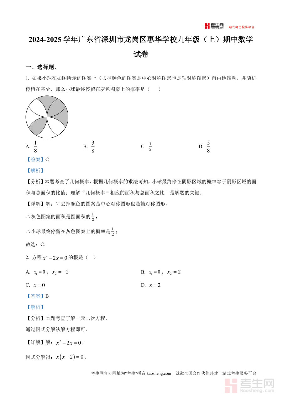 《精品解析:广东省深圳市龙岗区惠华学校2024-2025学年九年级上学期期中数学试卷(解析版)》是一份针对九年级上学期期中数学备考需求打造的精准化真题解析资料。该资料完整收录本次期中试卷全部题型(含选择题、填空题、解答题三大模块),每个题目均配备详实解析:不仅明确答案,更深度剖析考点如几何概率面积比计算、一元二次方程因式分解与配方法应用、菱形矩形性质综合等,同时提供解题思路点拨(换元法解复杂方程、几何旋转辅助线构造)及易错点提醒(忽视二次项系数非零条件等),精准贴合本地期中命题方向。
