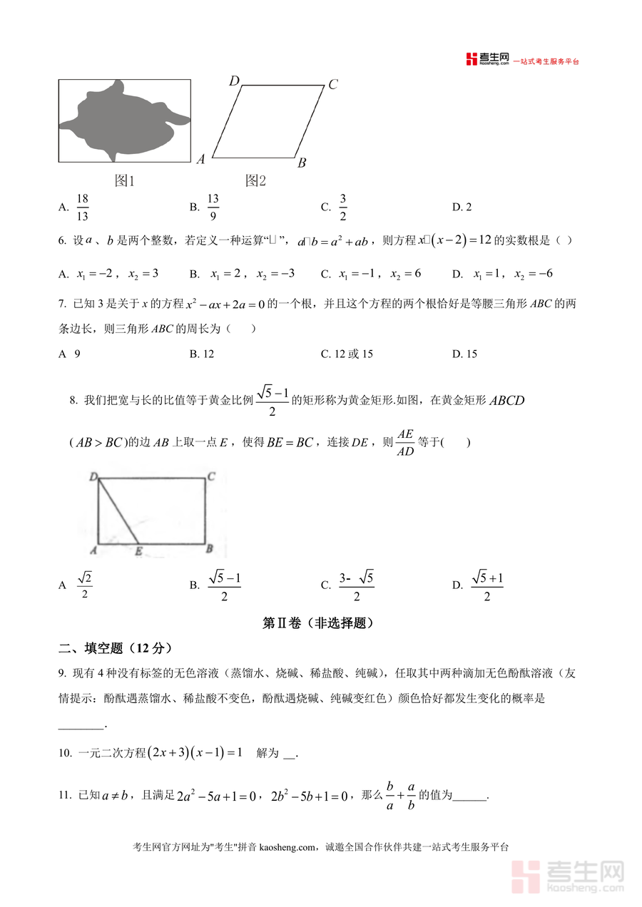 该资料核心用途在于帮助学生进行期中前知识检测与应试能力训练。使用场景涵盖课堂限时练习(模拟真实考试时长)、课后自主复习(针对薄弱题型强化)及教师课堂测试命题参考;对学生而言,通过完成试卷可精准定位知识漏洞(如一元二次方程参数取值范围、黄金矩形比例应用等易错题),提前适应考试节奏并提升时间分配能力;其备考优势在于题目设计紧扣深圳本地高频考点与题型规律,避免泛泛刷题,让复习更具针对性与高效性。