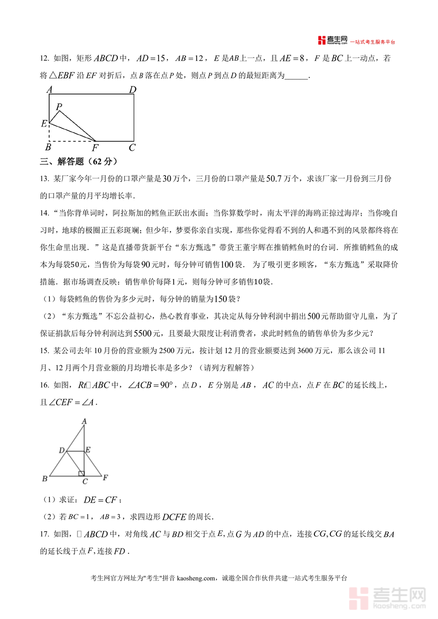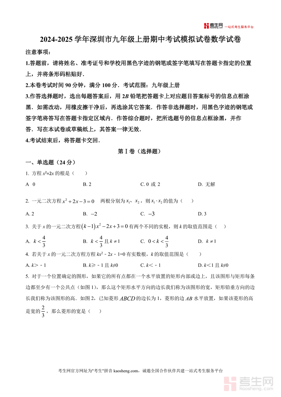 《精品解析:广东省深圳市2024-2025学年九年级上学期期中数学模拟试题(原卷版)》是一份针对广东省深圳市九年级学生设计的期中数学备考资料,严格遵循2024-2025学年本地教学大纲与期中命题趋势,覆盖九年级上册核心知识模块。资料包含90分钟满分100分的完整试卷结构——第Ⅰ卷选择题聚焦一元二次方程根求解、判别式应用、几何图形性质等基础考点;第Ⅱ卷填空题涉及概率计算、方程求解及矩形折叠问题;解答题则融合实际应用(如口罩产量增长率、鳕鱼销售利润问题)与几何证明(平行四边形、菱形相关求证),题型设置与分值分布贴合深圳期中真实考试场景,能有效还原考场体验。