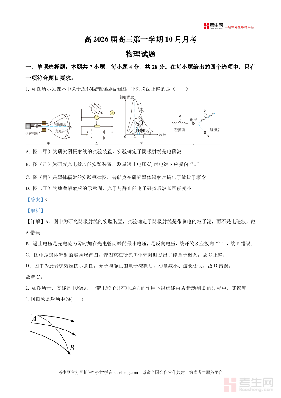 《精品解析:陕西省西安市陕西师范大学附属中学2025-2026学年高三上学期10月月考物理试卷(解析版).docx》是一份针对高三物理阶段性复习需求设计优质备考资料,涵盖单项选择、多项选择及非选择等典型题型(如近代物理插图分析、电场线与带电粒子运动结合题等),内容覆盖近代物理基础概念、电场力学综合应用、光学折射规律及实验探究等核心知识点,特色亮点在于每道题均配备详实解析——不仅包含选项正误判断依据,还融入考点点睛与解题思路拓展,例如对康普顿效应中光子波长变化原理及光电效应遏止电压测量方法进行深度剖析,助力学生理解底层逻辑而非机械记忆。