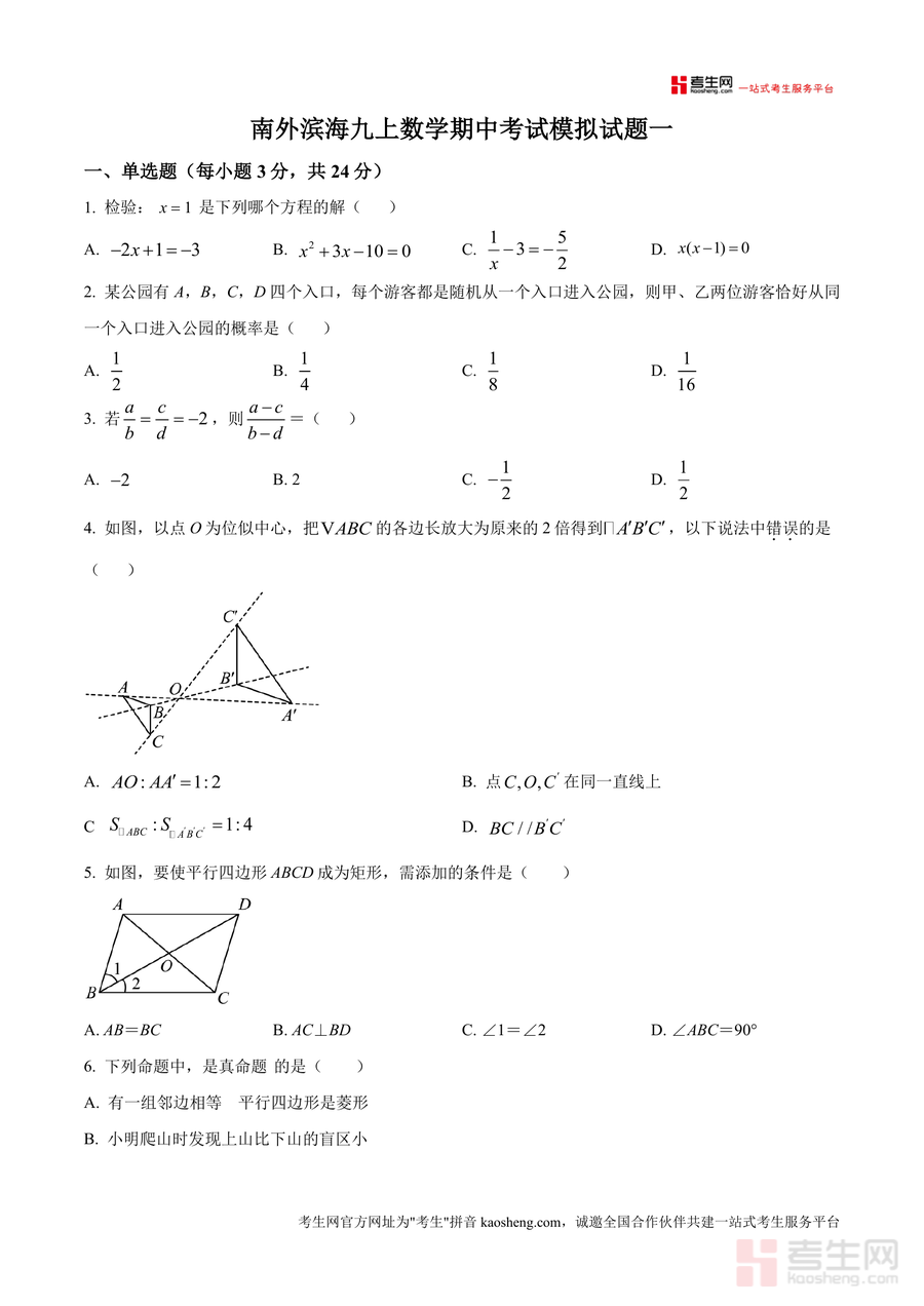 《精品解析:广东省深圳市南山外国语集团滨海学校2024-2025学年九年级上学期数学期中考试模拟试题一(原卷版).docx》是一份针对该校九年级学生数学期中考试设计的高质量备考资料。主要内容涵盖单选题、填空题、解答题三大题型,覆盖一元二次方程求解、概率计算、几何图形性质分析、函数应用等核心知识点,题目设计严格贴合该校教学进度与考试风格,具有较强的针对性和实用性。特色亮点在于试题结构与分值分布精准匹配期中考试要求,能够有效帮助学生熟悉考试形式和难度梯度,为备考提供真实的模拟体验。