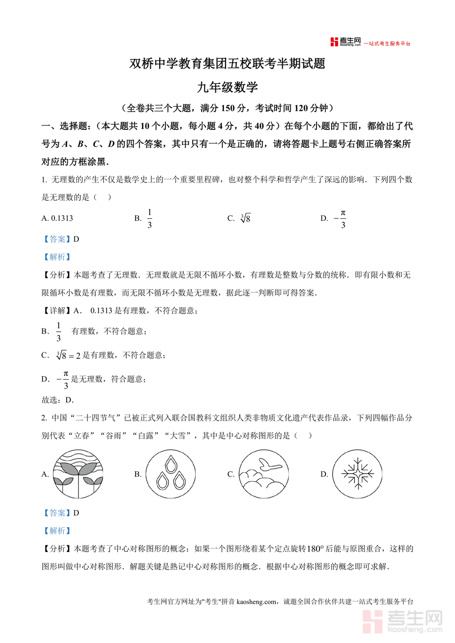 本资料适用于重庆市双桥中学教育集团及周边学校九年级学生(用于同步备考)、初中数学教师(作为教学参考与试题资源)及教研人员(分析区域命题趋势)。其必要性在于填补了区域联考针对性解析资料的空白,不可替代性体现在真题来源权威且解析深度适配本地学情,长期价值则在于帮助学生构建系统数学思维框架与解题能力体系,为后续中考备考奠定坚实基础。