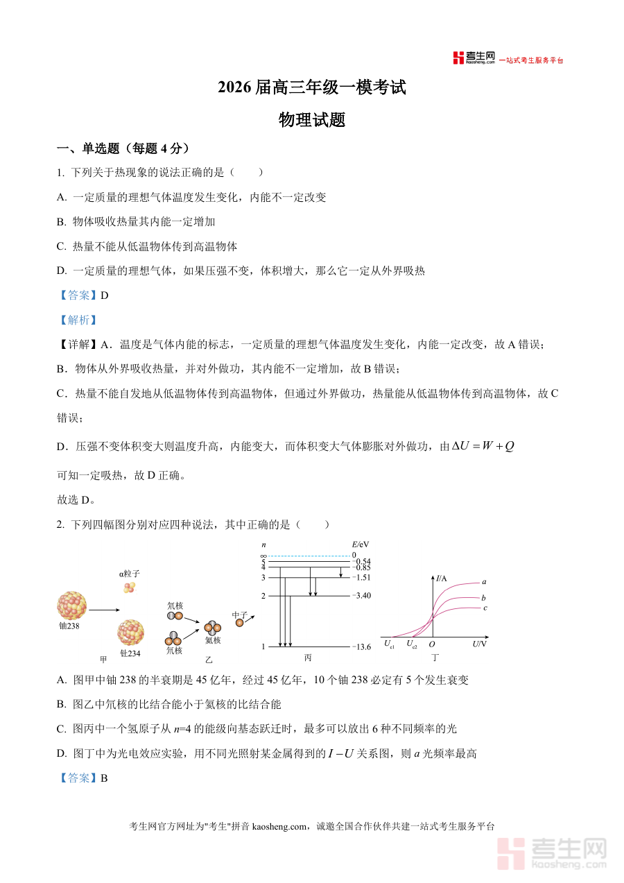 《精品解析:2026届四川省眉山中学校高三上学期一模物理试题(解析版).docx》是一份聚焦高三物理一轮复习关键节点、针对本地模考真题深度解析专业化备考资料。该资料完整呈现眉山中学校2026届高三上学期一模物理全卷试题(含单选、多选、实验题三大题型),并对每道题目分层解析:单选题中热学理想气体状态方程与热力学第一定律结合题进行推导验证,原子物理比结合能与衰变规律题明确概念误区;多选题中光电效应实验图像题结合爱因斯坦光电效应方程分析遏止电压与频率关系,电磁复合场轨迹分析题拆解洛伦兹力与电场力平衡逻辑;实验题"用油膜法估测分子大小"梳理步骤顺序与误差来源,每个选项标注易错点与教材对应知识点,既保证真题解析准确性,又突出解题方法可迁移性,是兼具权威性与实用性优质真题解析资料。