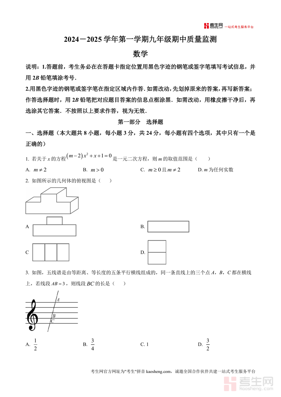 《精品解析:广东省深圳市南山实验教育集团麒麟中学2024-2025学年九年级上学期期中考试数学试卷(原卷版).docx》是一份针对深圳南山实验教育集团麒麟中学九年级学生期中备考的权威真题资料。该文件完整呈现了2024-2025学年上学期期中数学考试原卷内容,包含选择题(8小题)、填空题(5小题)及解答题(7小题),覆盖一元二次方程、几何图形三视图与位似变换、反比例函数与一次函数综合、统计概率、实际应用问题等九年级上册核心知识点。其特色在于严格遵循校内考试规范,保留完整答题说明与题型结构,精准贴合该校期中命题趋势,为学生提供真实校考场景还原,是兼具权威性与实用性的备考资源。