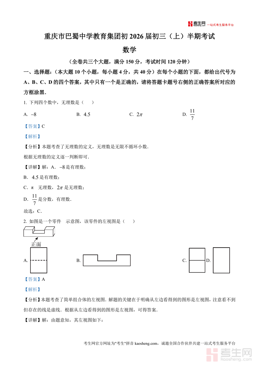 本资料适用于重庆市巴蜀中学及同类校九年级学生、初中数学教师及关注中考数学备考的家长群体。作为期中备考不可替代资料之一,其长期价值在于帮助学生积累典型题型解法、形成系统知识框架,不仅能应对本次期中考试,更能为后续中考复习奠定坚实基础,是提升数学学科核心素养的重要工具。