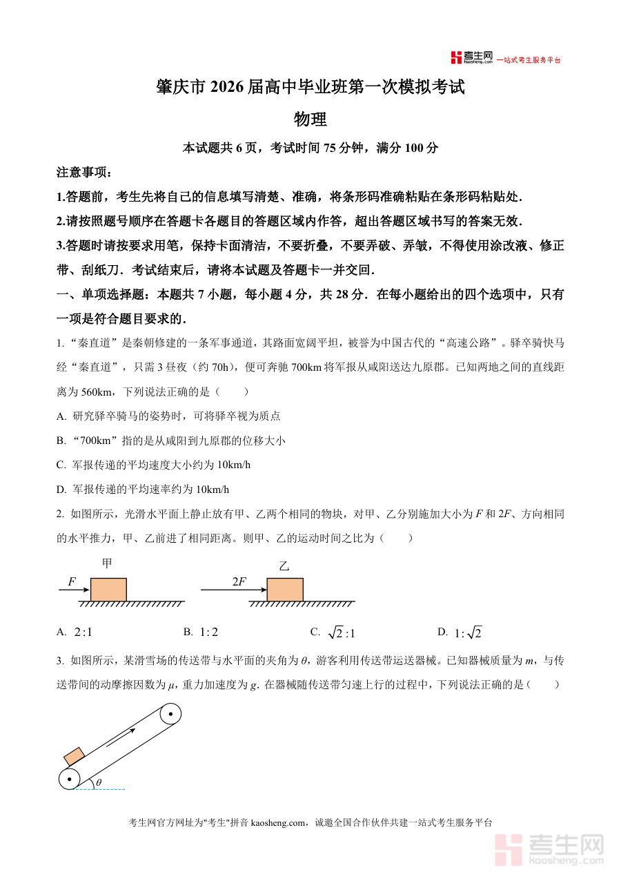 本资料适用于2026届肇庆市及周边地区高三物理备考学生、高中物理教师及备考辅导机构;作为本地权威模拟试题,它与高考衔接紧密,能让学生提前适应考试节奏与题型特点,长期价值在于帮助构建系统物理知识体系,为冲刺阶段奠定坚实基础,具有不可替代性,是高三物理备考不可或缺 的重要资料。