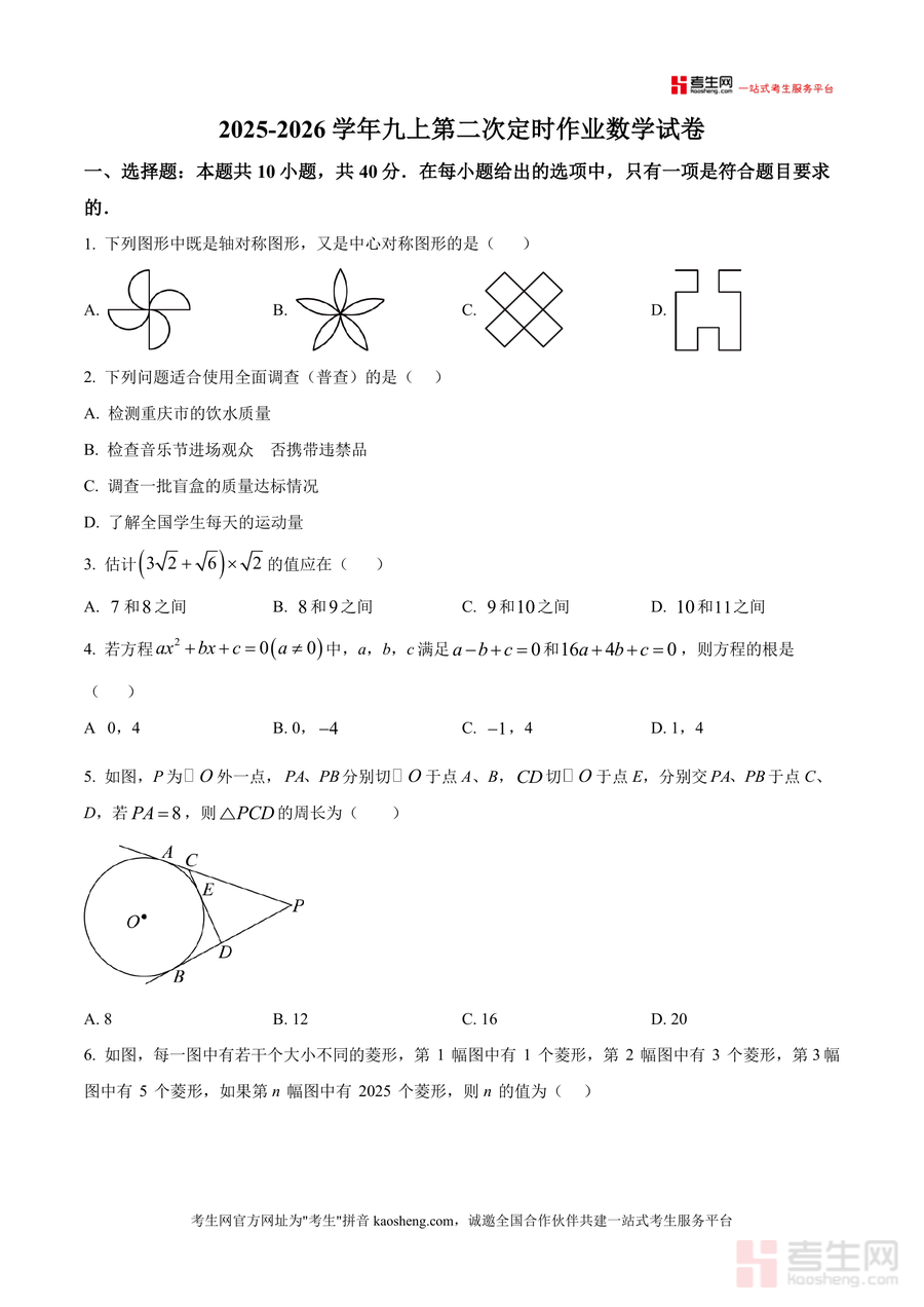 《精品解析:重庆市徐悲鸿中学校2025-2026学年上学期九年级期中数学试卷(原卷版)》是一份针对九年级学生期中数学备考设计的高质量原卷资料。试卷结构完整规范:包含选择题10小题(40分)、填空题6小题(24分)及解答题9小题(共86分);覆盖几何图形性质(轴对称与中心对称判定、扇形阴影面积计算、菱形与正方形性质应用)、代数运算(一元二次方程求解、整式化简求值)、函数应用(反比例函数关系判断、二次函数图像变换与最值分析)、概率统计(事件概率计算、数据整理分析与估计)等核心考点;特色亮点在于严格还原该校期中命题风格与题型分布,保留真实答题要求及命题细节。