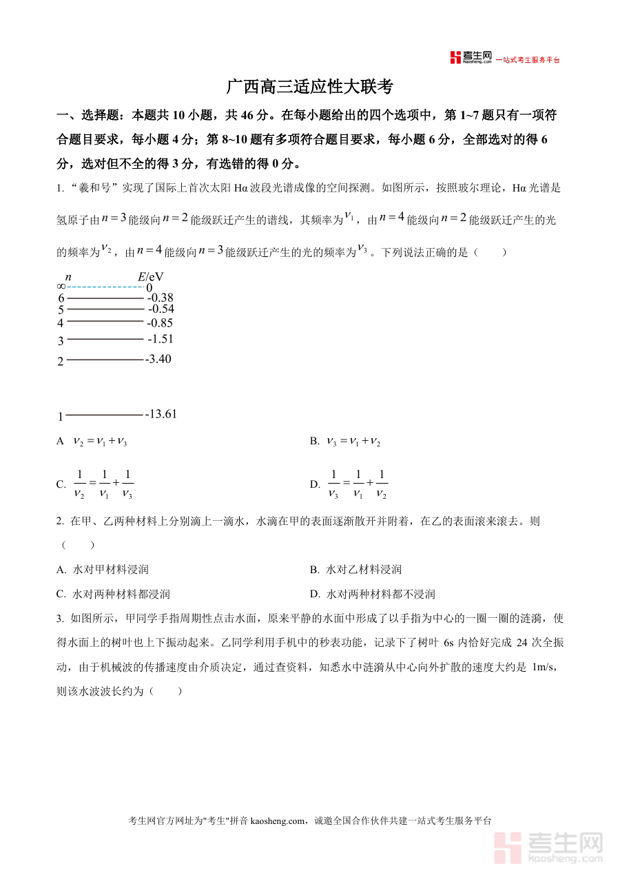 《精品解析:2026届广西南宁市高三上学期适应性大联考物理试卷(原卷版).docx》是一份针对2026届广西南宁市高三学生物理学科适应性大联考设计的专业备考资料,包含完整原卷内容,涵盖选择题(1-7题为单选、8-10题为多选)及非选择题(实验题2道、计算题3道)两大题型,覆盖力学、电磁学、光学、原子物理等高中物理核心知识模块;题目设计贴合本地教学进度与联考命题趋势,融入“羲和号”太阳探测、人形机器人特技等前沿科技情境及生活应用案例,兼具知识性与时效性,能有效激发学生学习兴趣并强化知识迁移能力。