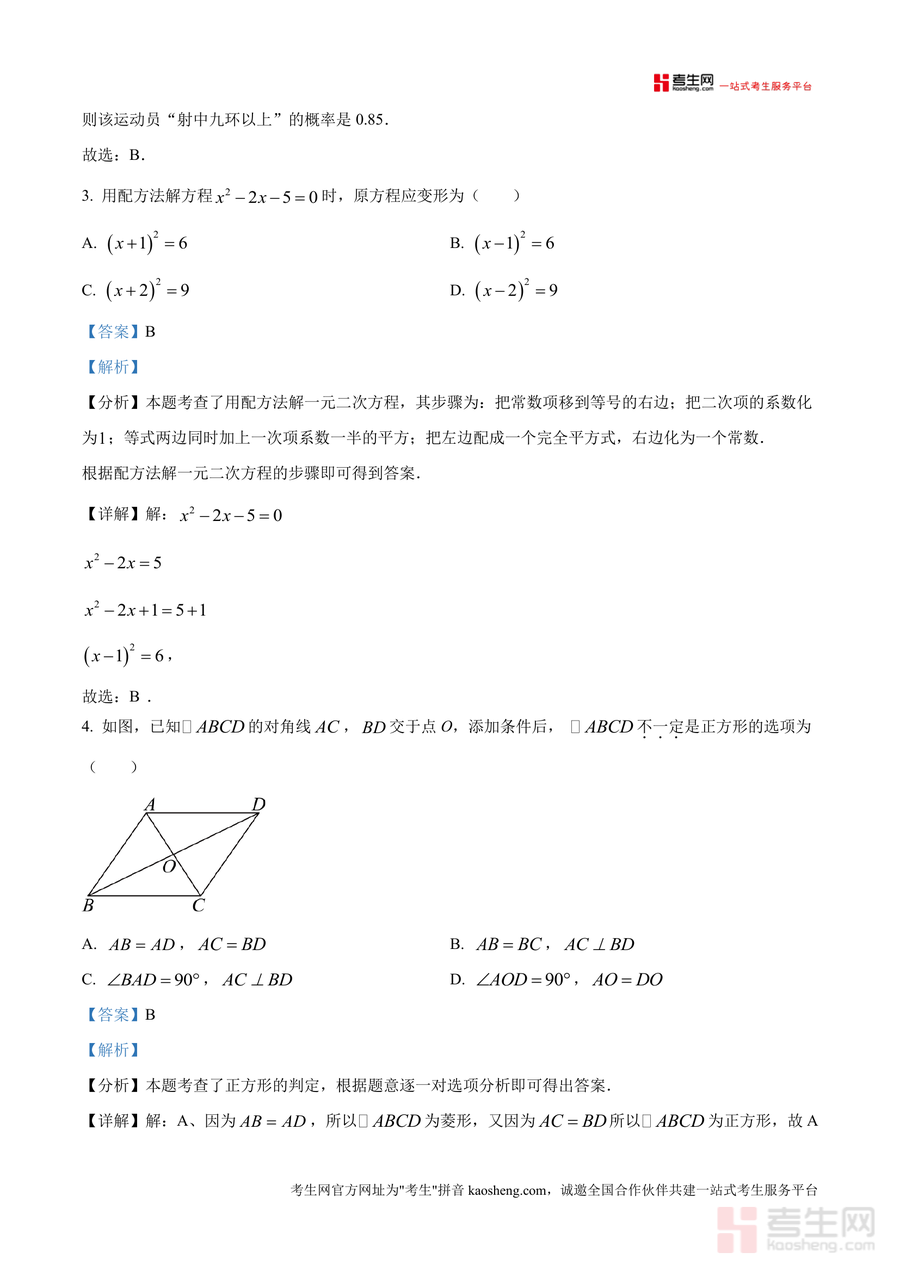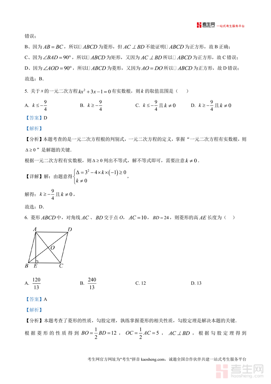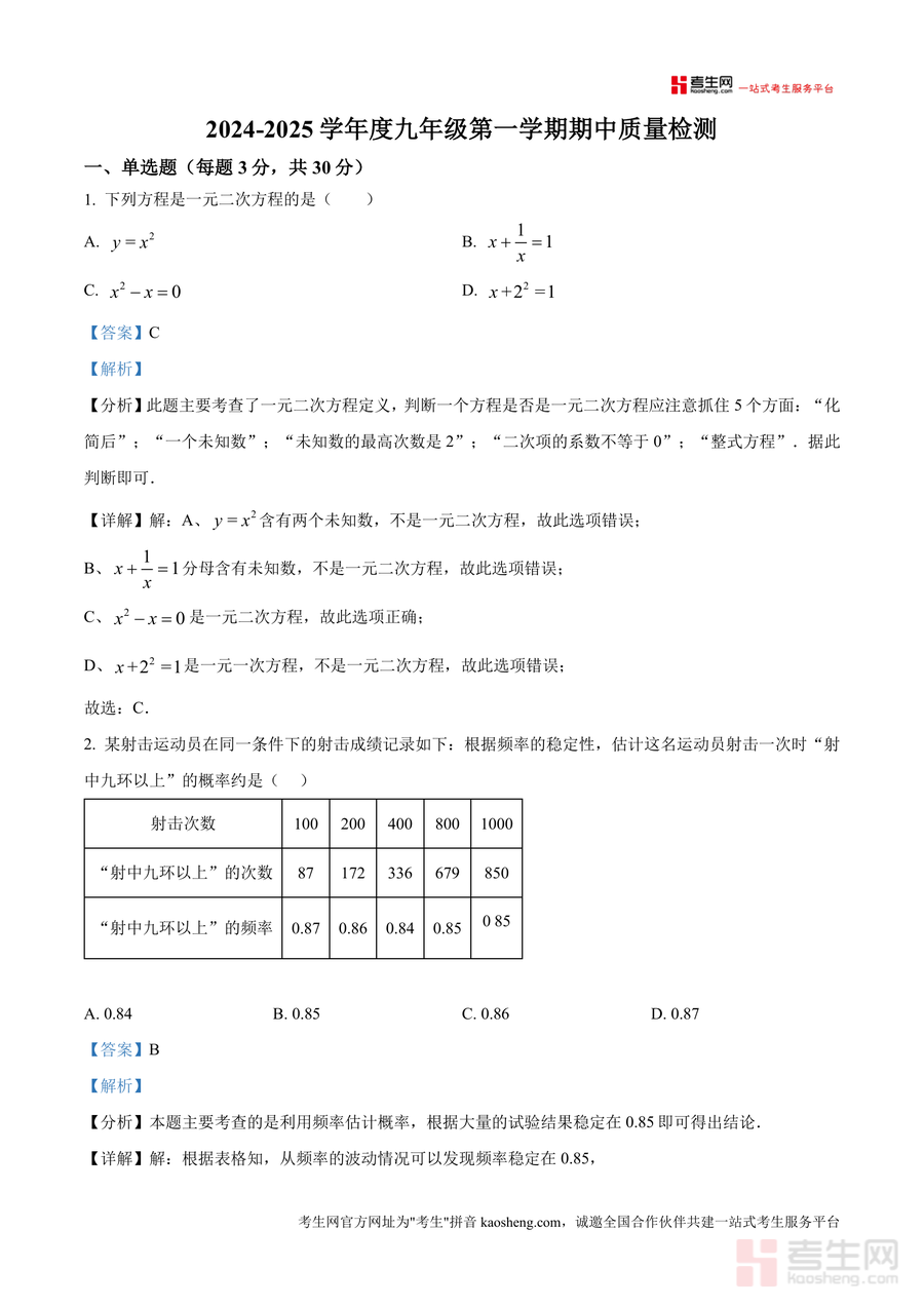 《精品解析:广东省深圳市宝安区振兴学校2024-2025学年九年级上学期期中模拟数学试题(解析版)》是一份针对该校九年级上学期期中数学备考设计 的高质量模拟试题及配套解析资料。资料包含单选题、填空题、解答题三大题型共20道题目,覆盖一元二次方程定义与解法、概率计算与应用、几何图形(菱形、矩形、正方形等)性质及判定等核心知识点;每道题均配备详细解析内容——含考点分析、解题步骤及思路点拨,如一元二次方程题明确"化简后未知数最高次数为2且系数不为0" 的判定标准,并结合实例逐一排除错误选项,几何题则通过辅助线构造、勾股定理应用等方法引导学生掌握解题技巧。