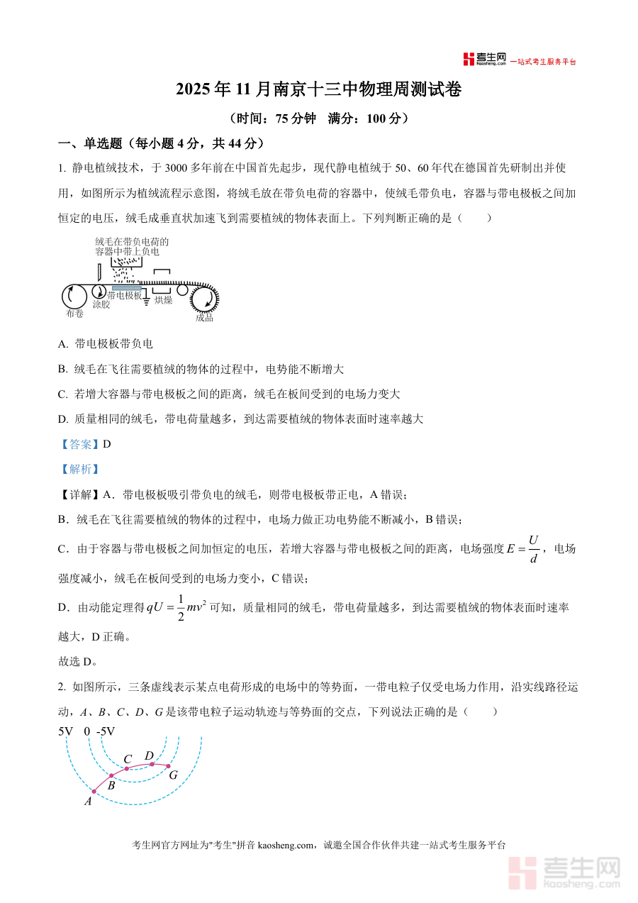 《精品解析:2026届江苏省南京市第十三中学高三上学期模拟预测物理试题(解析版)》是一份面向2026届高三学生及物理教师的专业化备考资料,核心定位为辅助提升物理应试能力 的真题解析类资源。资料涵盖静电场、动量定理、简谐运动、电磁学等高考核心模块题型(如单选题中的静电植绒技术应用、等势面分析,实验题中的金属丝电阻率测定等),特色亮点在于每道题配备详尽解析——包含选项正误推导、公式应用说明及考点关联分析,同时贴合南京十三中教学节奏与江苏高考命题方向。