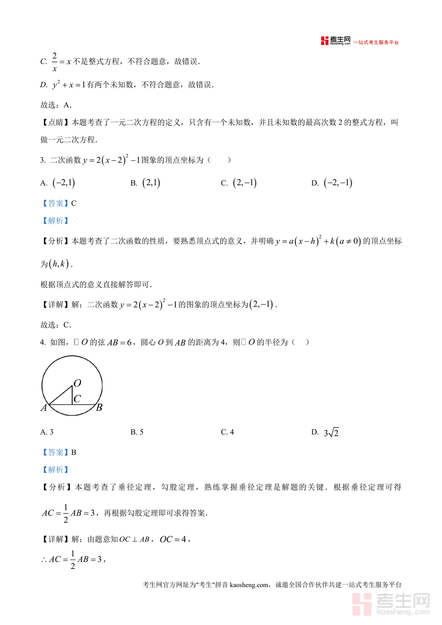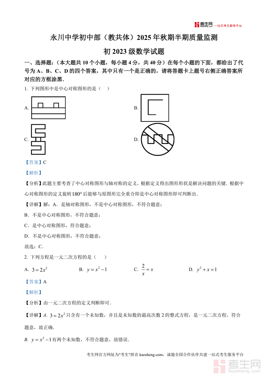 《精品解析:重庆市永川中学校2025-2026学年九年级上学期期中数学试卷(解析版)》是一份针对永川中学初中部九年级上学期期中数学考试设计优质备考资料。文件包含完整试卷原题及逐题详细解析,覆盖中心对称图形识别、一元二次方程定义与根判别式应用、二次函数顶点坐标与图像性质分析、垂径定理计算等核心考点。其特色在于解析部分不仅给出正确答案,还通过"分析"环节明确考点归属及解题思路,"详解"步骤清晰且逻辑严谨,"点睛"部分总结方法技巧,帮助学生构建系统知识框架。