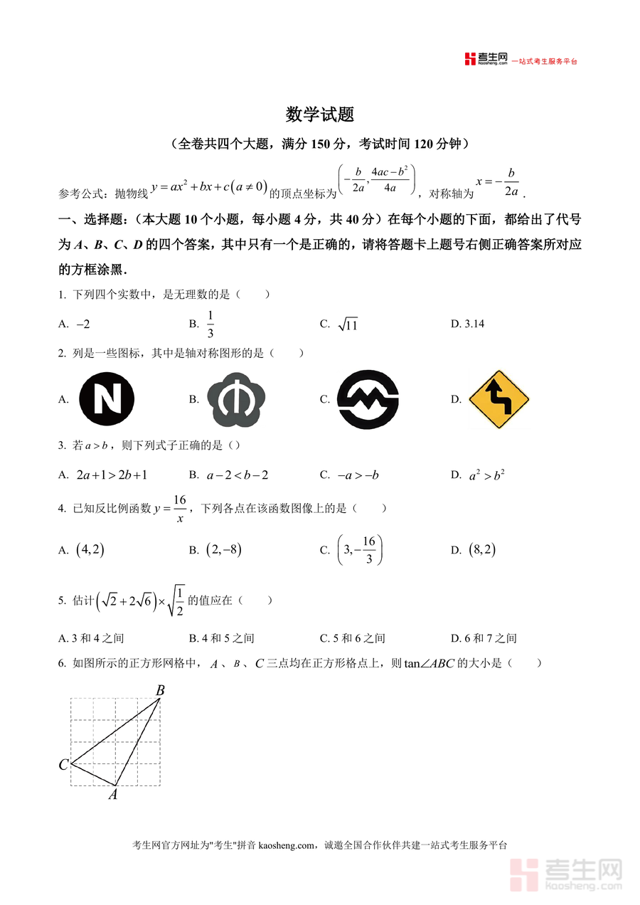 《精品解析:重庆市江北区重庆八中宏帆中学校2025-2026学年九年级上学期11月期中数学试题(原卷版)》是一份聚焦九年级上学期数学核心考点、贴合重庆本地教学进度的优质真题资源。该试题严格遵循中考数学命题框架设计,包含选择题(10小题)、填空题(6小题)及多类型解答题,全卷满分150分且考试时间设定为120分钟,覆盖无理数判断、轴对称图形识别、函数图像分析、几何证明与计算等关键知识点,完整还原了名校期中测试的真实题型结构与难度梯度,其特色在于保留原卷排版格式与考试要求细节,确保使用者获得沉浸式练习体验。