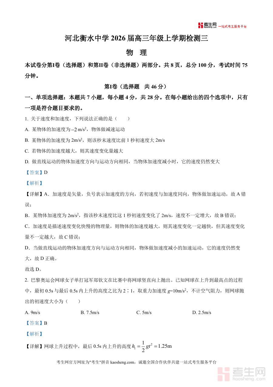 《精品解析:2026届河北省衡水中学高三上学期检测三物理试题(解析版).docx》是一份针对高三物理一轮复习阶段设计 的高质量备考资料,聚焦力学核心考点与实验技能考查,涵盖单项选择、多项选择及非选择题三大题型共15道试题(含5道非选择题)。资料特色在于解析详实且深度贴合高考命题逻辑,如对速度与加速度关系的选项逐一剖析物理概念本质、运用开普勒第三定律与变轨原理分析卫星运动问题,并结合运动学图像斜率意义、动能定理等核心知识构建解题模型;同时实验题部分详细说明误差来源与数据处理方法,帮助学生掌握规范答题思路。