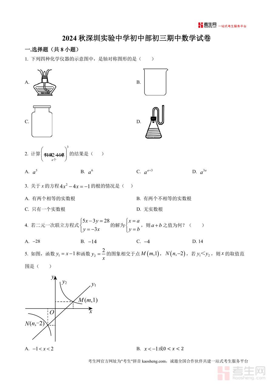 本试卷适用于深圳实验中学及深圳地区其他学校的九年级学生、初中数学教师及中考备考者。对于学生而言,它不仅是期中复习资料,更是了解名校命题趋势与巩固核心知识点的重要工具;对于教师则可作为教学案例分析或试题命制参考依据。其不可替代性体现在源自一线名校真实考试资源,能有效弥补普通教辅材料与学校实际教学需求间的差距;长期来看有助于学生构建系统知识体系并培养数学思维能力,为后续中考复习奠定坚实基础——是九年级数学学习过程中不可或缺的优质资料。