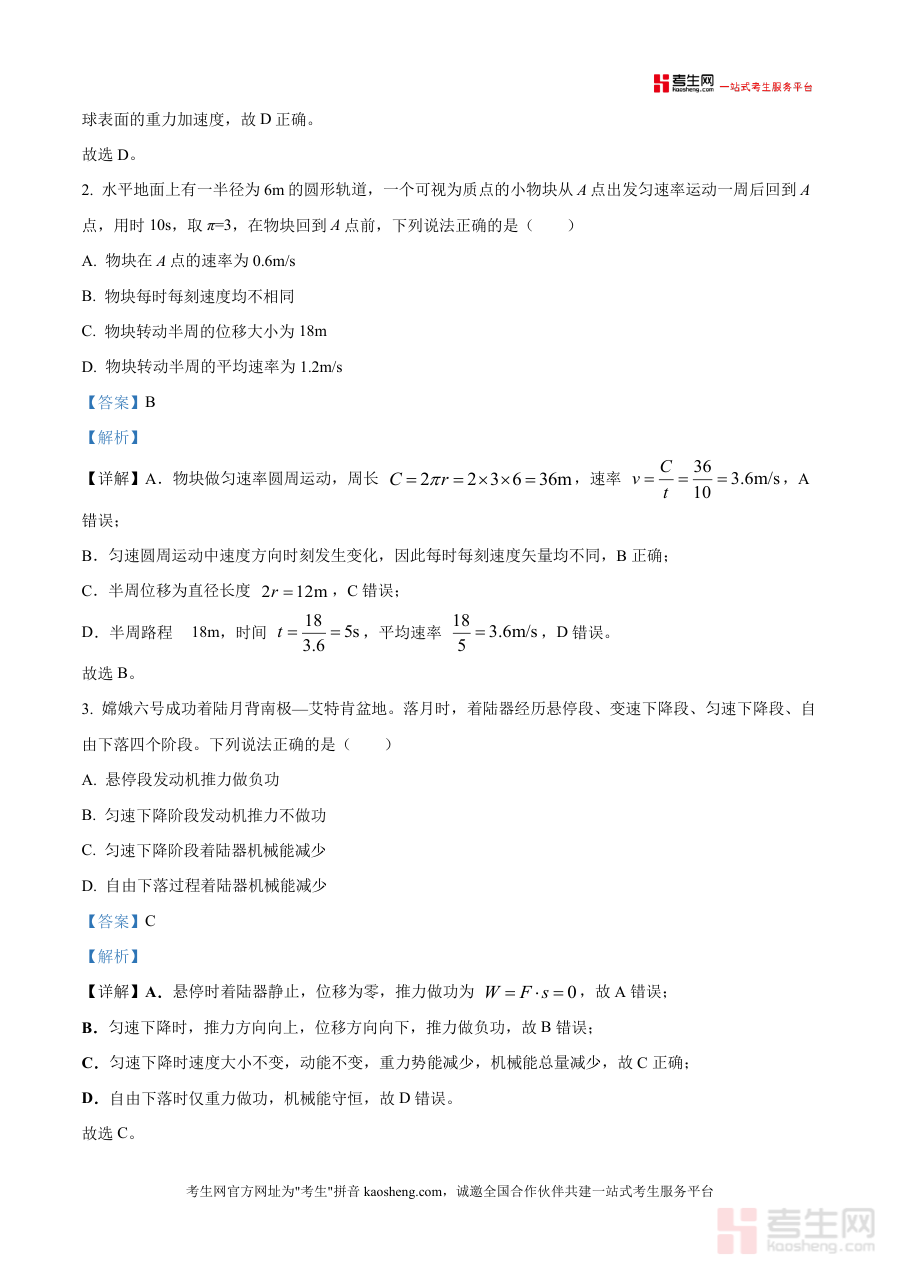 《精品解析:2026届河南省高三上学期天一小高考(二)物理试卷(B)(解析版).docx》是一份针对河南省天一联考高三物理阶段性测试的专业真题解析备考资料,聚焦试卷中单项选择、多项选择及非选择(含实验题)等题型的核心考点与解题逻辑。内容涵盖运动学基础(如质点判断、匀速圆周运动)、力学分析(如受力平衡、冲量计算)、航天科技关联考点(神舟二十号出舱活动、嫦娥六号落月阶段分析)及实验探究(平抛运动规律验证)等模块,特色亮点在于解析过程结合最新科技案例与本地联考命题趋势,通过逐题拆解题干条件、推导公式应用及易错点标注,帮助学生精准把握解题思路。