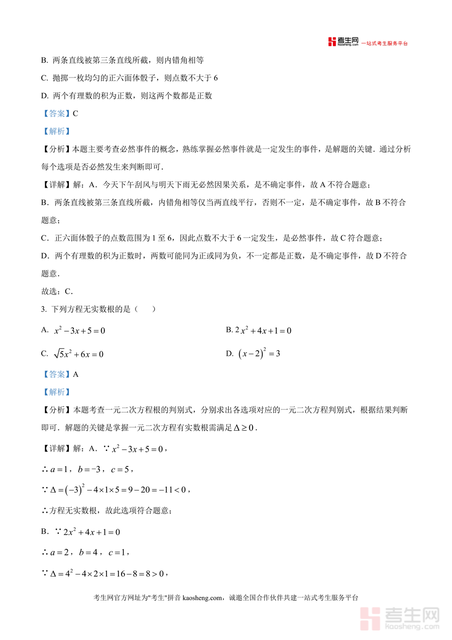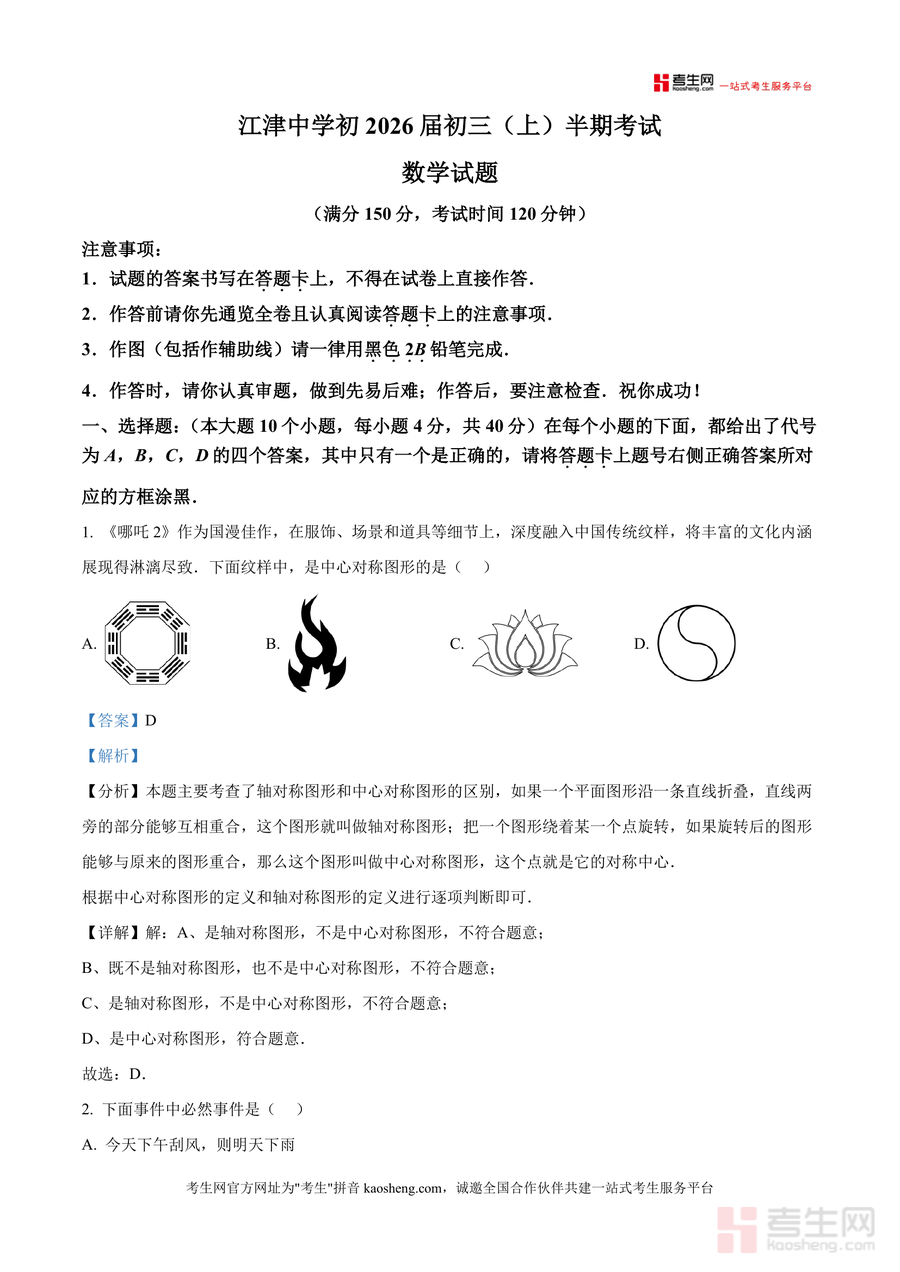 《精品解析:重庆市江津中学校2025-2026学年上学期九年级数学期中考试(解析版).docx》是一份针对江津中学初三年级上学期数学期中测试设计开发的数据备考资料。该资料包含完整试题及逐题详细解析,覆盖中心对称图形判断、必然事件识别、一元二次方程根判别式应用等九年级数学核心知识点。其特色亮点在于解析不仅呈现标准答案,还深度剖析解题思路、考点分布及易错点提醒,如对选择题中中心对称图形概念进行对比阐释,对一元二次方程无实根条件展开推导,帮助学生理解本质而非死记硬背。