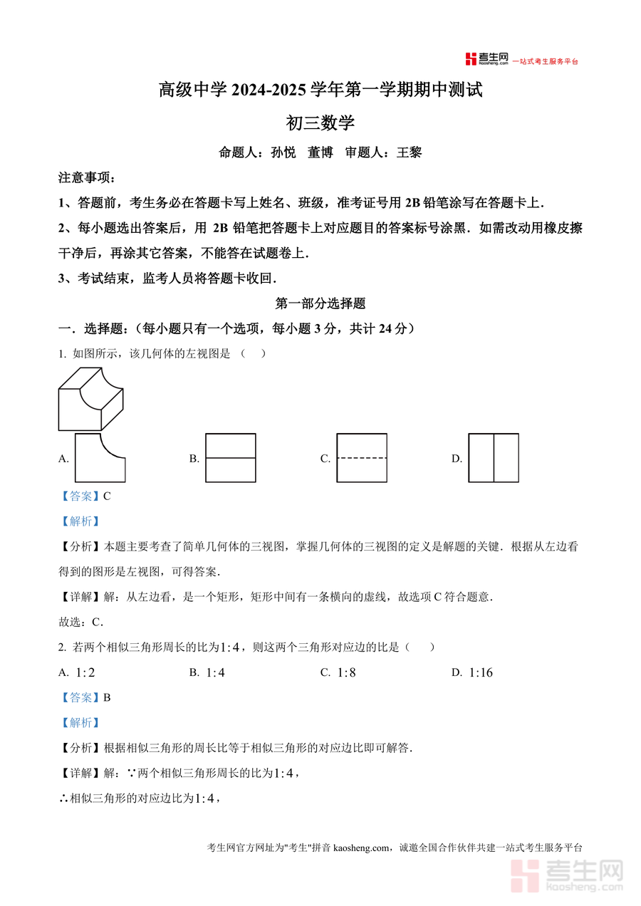 《精品解析:广东省深圳市深圳高级中学2024-2025学年九年级上学期期中考试数学试卷(解析版).docx》是一份聚焦深圳高级中学九年级期中数学考情的权威备考资料,涵盖完整试卷原题及逐题深度解析。资料由该校资深命题团队编写审核,确保内容贴合校考命题逻辑;解析部分覆盖三视图识别、相似三角形周长比与对应边比关系、特殊四边形判定等核心考点,每道题均包含考点分析、详细解答步骤及易错点提醒,帮助使用者全面掌握解题方法。