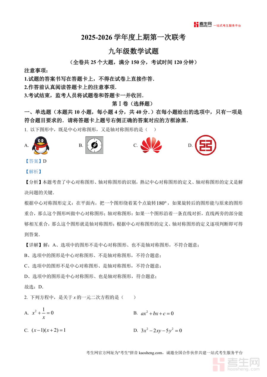 《精品解析:重庆市江津区实验中学、李市中学、白沙中学等金砖五校2025-2026学年上学期期中联考九年级数学试题(解析版)》是一份针对区域重点校联考的九年级数学期中真题解析资料,涵盖全卷25个大题(含10道单选题、6道填空题、9道解答题)的完整解题过程与深度剖析。资料特色在于每题配备“分析—详解—点睛”三段式解析结构:分析部分明确考点(如中心对称图形识别、一元二次方程概念)与解题思路;详解部分采用规范步骤呈现计算或推理过程;点睛部分提炼易错点与解题技巧(如单循环比赛的方程建模方法),帮助学生精准把握真题考点与命题规律。