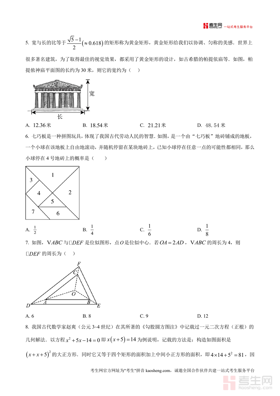 《精品解析:广东省深圳市盐田区2024-2025学年九年级上学期期中数学试卷(原卷版).docx》是一份聚焦广东省深圳市盐田区九年级上学期期中数学考试的专业备考资料。该试卷严格依据当地初中数学教学大纲及期中命题要求编制,包含选择题8小题(24分)、填空题5小题(15分)、解答题7小题(61分)三大题型,覆盖三视图识别、一元二次方程根的求解与判别式应用、特殊四边形性质及证明、概率计算、位似图形性质、黄金矩形应用等九年级上册核心知识点。作为原卷版资料,其题型设置、分值分布与本地期中真题高度契合,且融入了地域文化元素与生活情境实例(如隋朝青瓷文物三视图分析、帕提侬神庙黄金矩形计算等),具有较强地域针对性与实战参考价值。